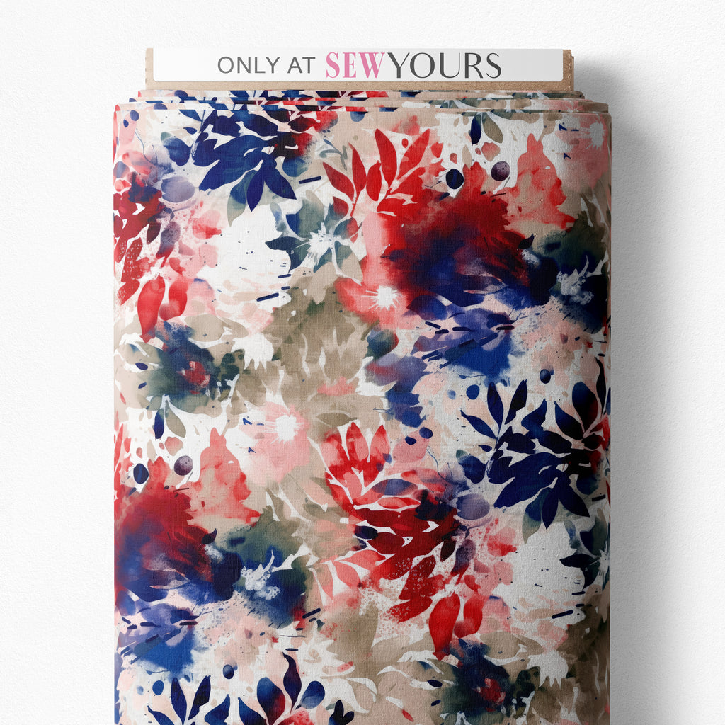 Featuring hues of red, white, blue & beige this gorgeous watercolor print can only be found at Sew Yours.