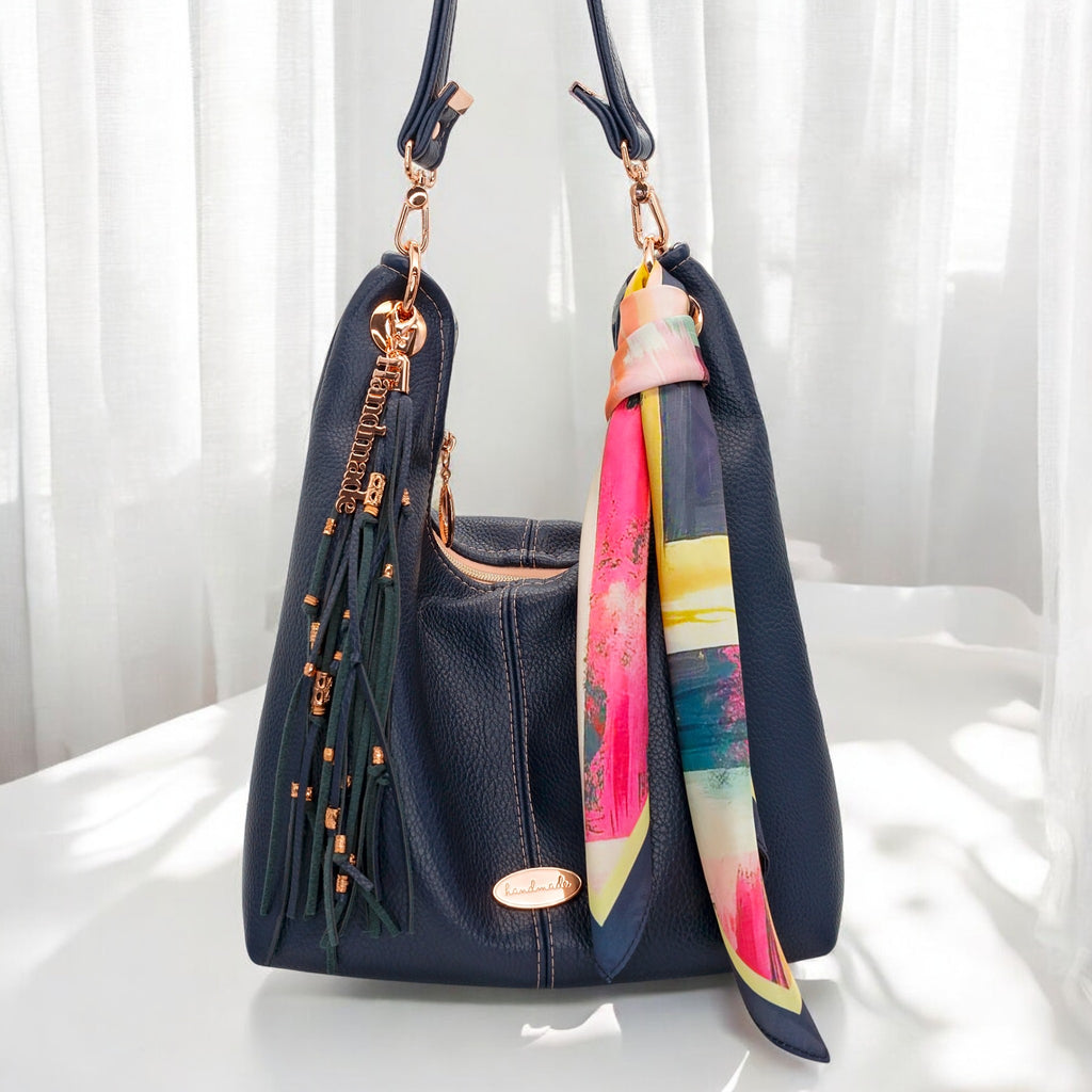 Although created as an accent for your handbags, this versatile 21.5"x21.5" scarf can also be styled in countless ways. Wrap it around your ponytail, wear it as a neck scarf, tie it around your wrist, loop it through belt loops, or accessorize your hat. Lightweight and easy to fold, it’s the perfect finishing touch to elevate your look or your handmade bags.