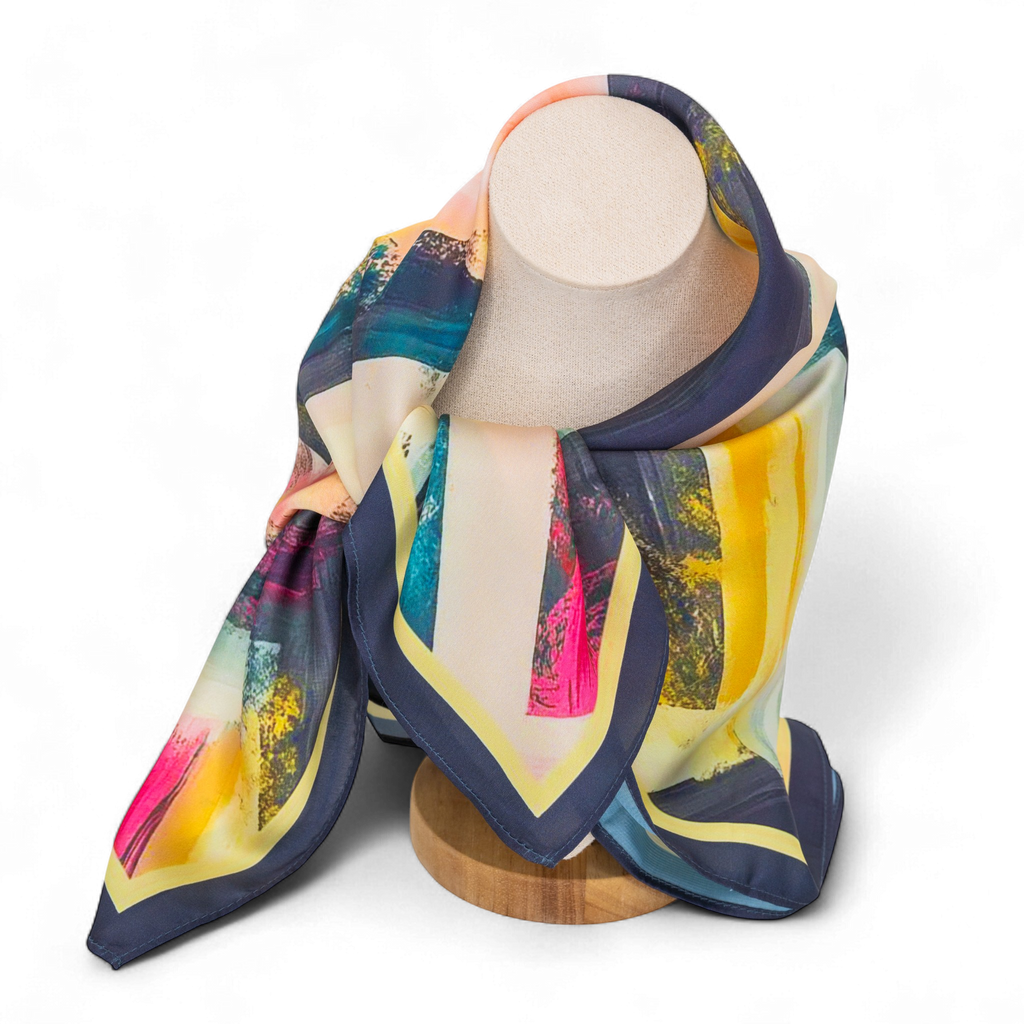 Add a bold artistic touch to your handbag or outfit with the Painted Motion Abstract Scarf. Made from smooth imitation plain silk, it offers a soft, glossy feel that drapes beautifully. This exclusive Sew Yours design features expressive painterly brushstrokes arranged in a chevron pattern with shades of navy, blush, mustard, and teal.