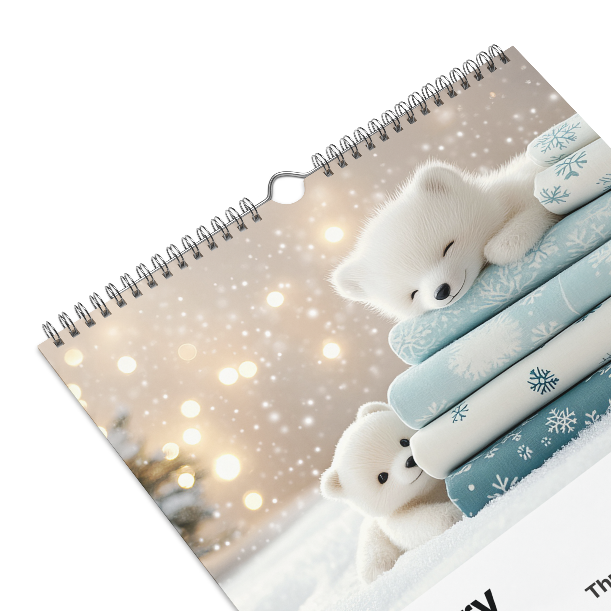 Cuddles & Cotton 2026 Wall Calendar brings cozy fabric stacks and adorable woodland animals to your sewing room. Each month features warm, soft photography that quilters and bag makers love, with clear monthly grids for easy planning.