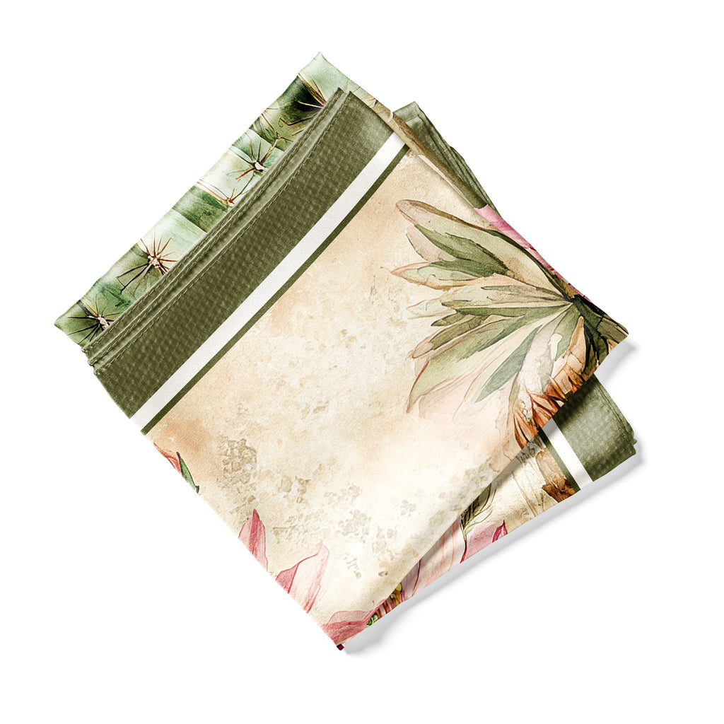 | Design | Exclusive Sew Yours design featuring watercolor desert cacti and pink blooms against a warm sand background. Printed on one side. |