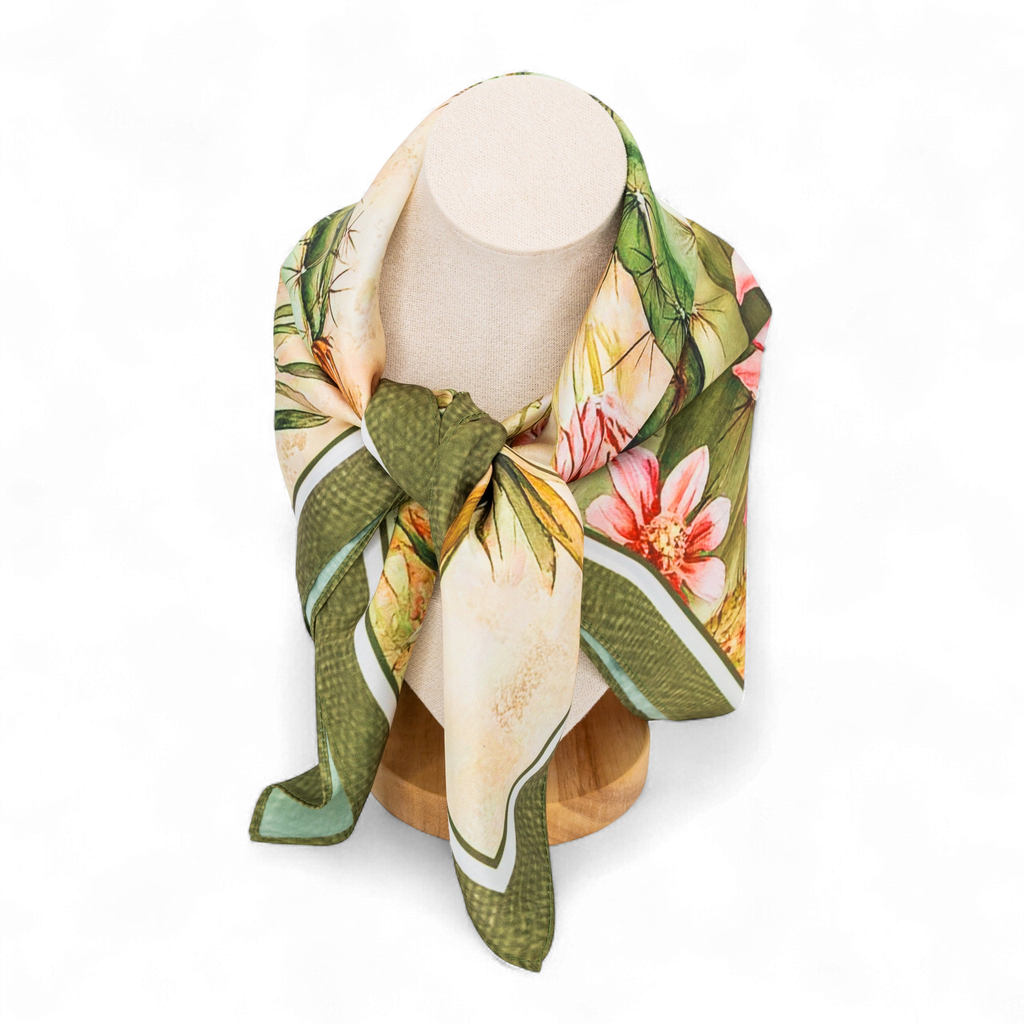 Add a touch of desert beauty to your handbag or outfit with the Desert Bloom Floral Scarf. Made from smooth imitation plain silk, it offers a soft, glossy feel that drapes beautifully. This exclusive Sew Yours design features watercolor-style cacti and desert flowers in soft pink, sage, and sand tones for a look that’s both natural and refined.
