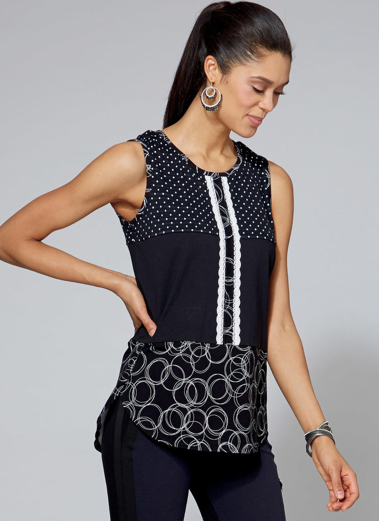 McCall’s M7600 Misses’ & Women’s Contrast Knit Tops is an average-skill knit top pattern designed for moderate stretch knits (35% cross-grain). Semi-fitted pullover tops feature contrast panel options, a round neckline with band, sleeve variations, and a curved shirt-tail hem.