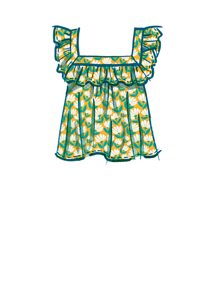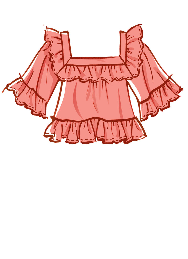 | Views Included | Views A–C: A cropped with sleeve and hem ruffles, B cropped sleeveless with ruffle straps, C hip-length short sleeve |