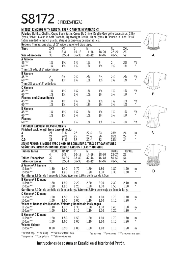 Pattern Name Simplicity S8172 Misses’ Fashion Kimonos