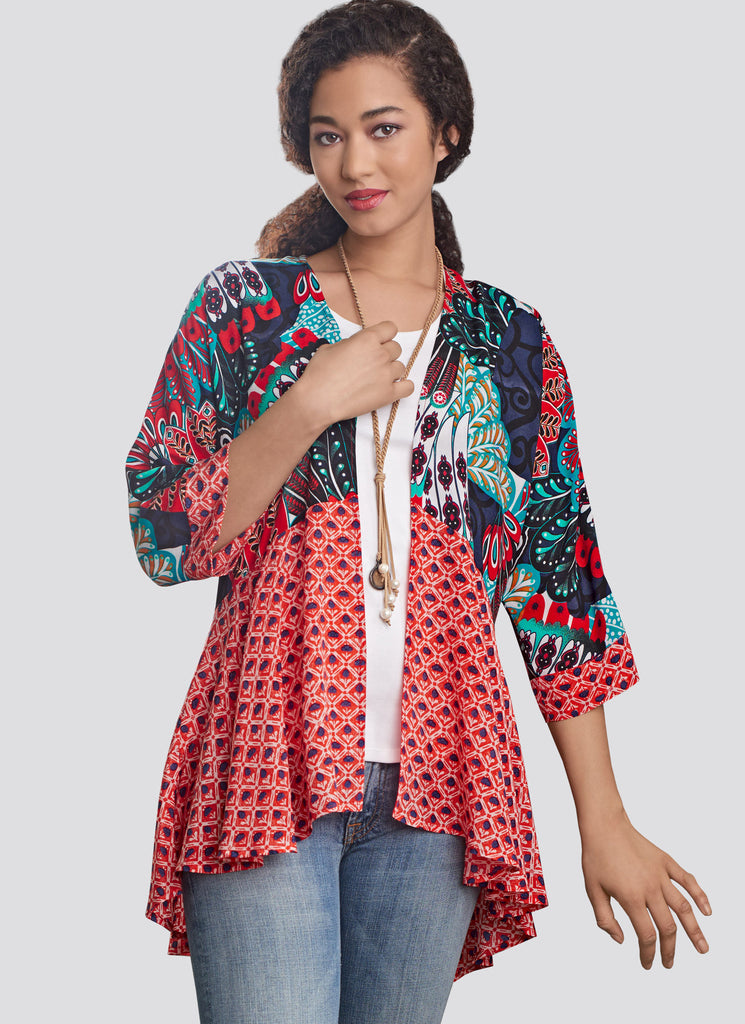 Simplicity S8172 Misses’ Fashion Kimonos is an easy kimono jacket sewing pattern with length, fabric, and trim variations. Sew chic layering pieces with options for fringe, lace, ruffles, or flounces using drapey wovens like challis, crepe, georgette, or jacquard. Mix contrast fabrics and decorative trims to create lightweight toppers that work for casual outfits, festivals, or evening looks.