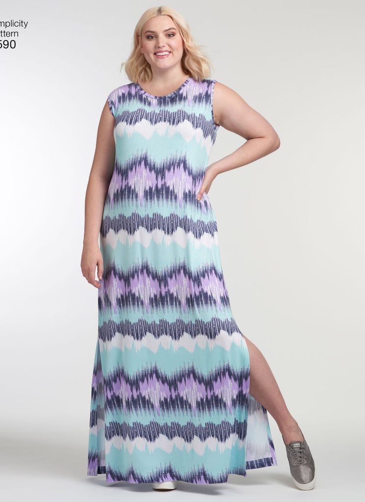 Simplicity S8590 Women’s Knit Dresses is an easy sewing pattern designed for stretch knits. Create flattering plus-size knit dresses in two lengths with sleeve options including cold shoulder, sleeveless, or short sleeve. All views feature a crew neckline and can be made in mini or maxi length.