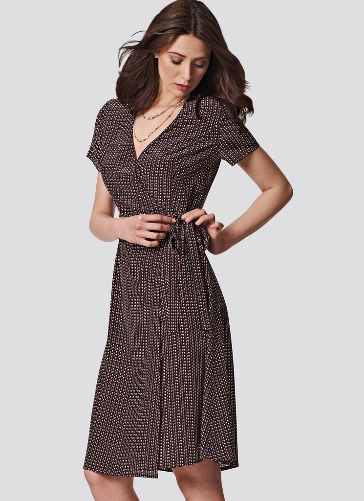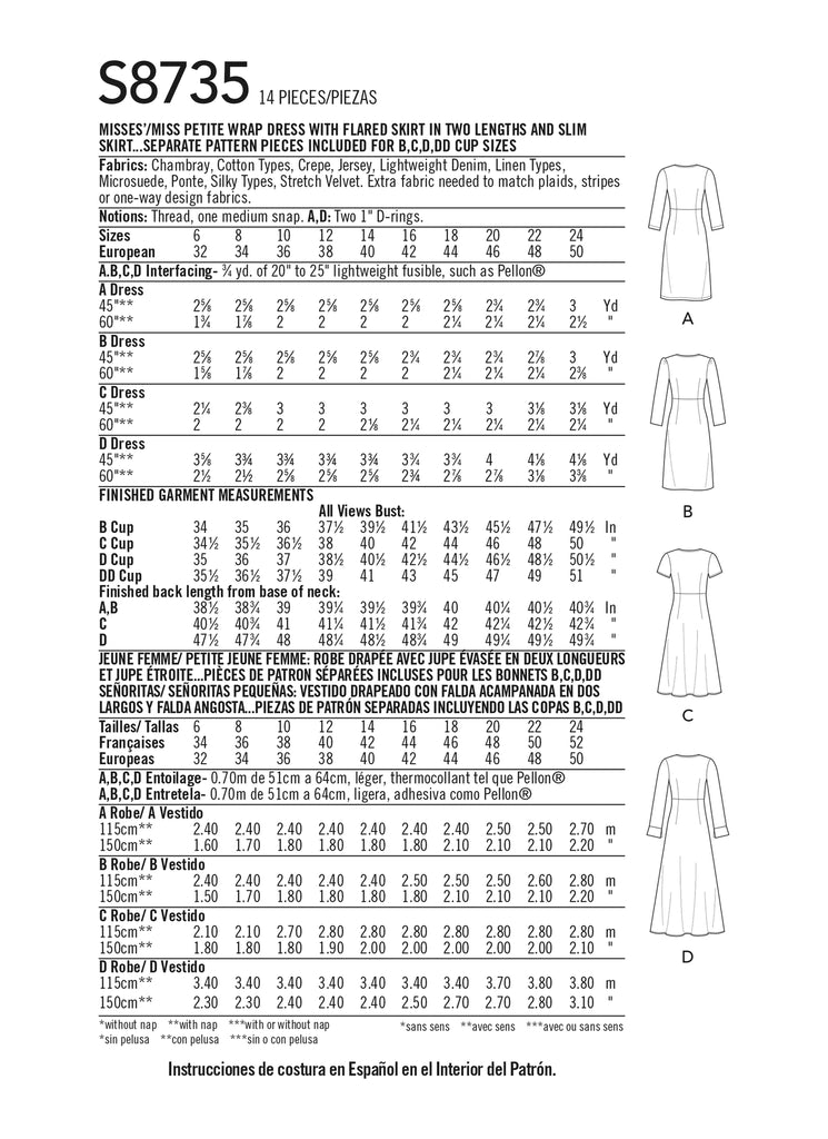Simplicity S8735 Misses’/Miss Petite Wrap Dress is a versatile sewing pattern designed by the American Sewing Guild. Create a wrap dress with a slim or flared skirt, offered in two lengths with sleeve variations. Pattern includes separate pieces for B, C, D, and DD cup sizes for a custom fit. Sew this dress in woven or knit fabrics such as chambray, crepe, ponte, linen, or stretch velvet.