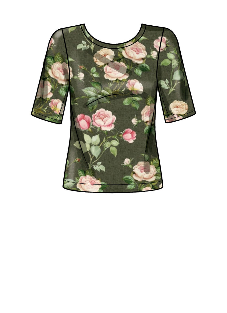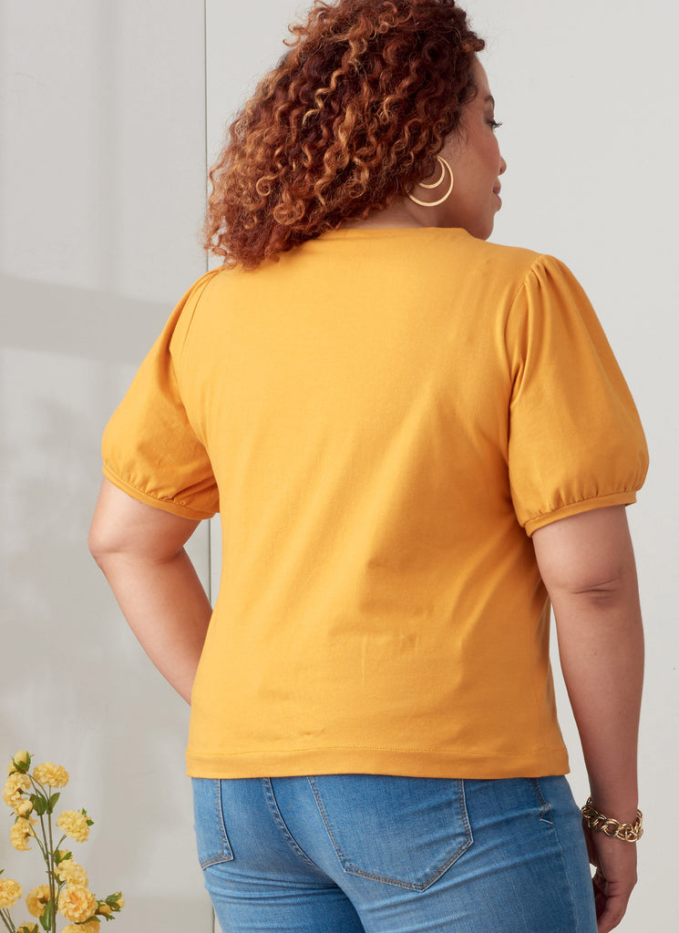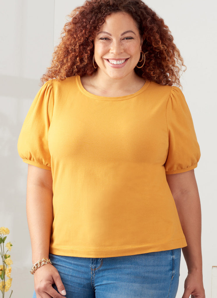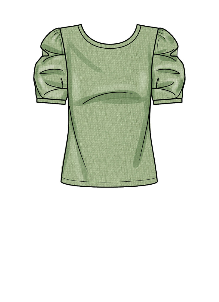 Simplicity S9273 Misses’ Knit Tops is an easy sewing pattern for stretch knits. Create versatile scoop neck tops with three sleeve variations: classic fitted sleeve, gathered puff sleeve, or pleated sleeve. Designed for bamboo, interlock, jersey, ITY, and knit blends. Suitable for overlock/serger sewing.