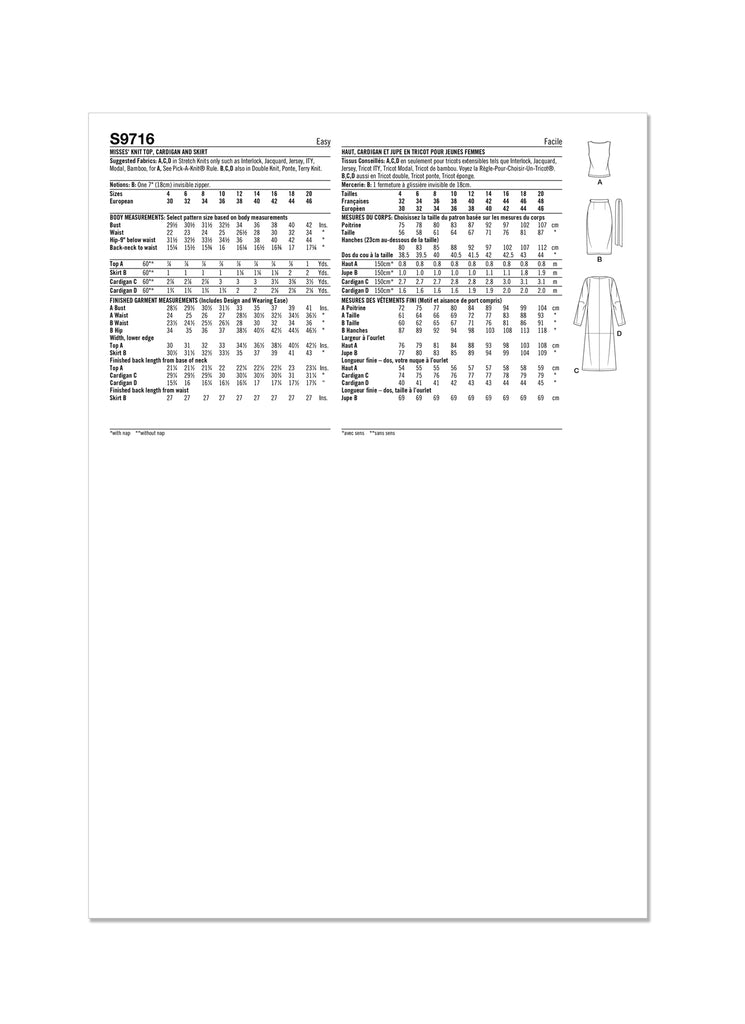 | Pattern Name | Simplicity S9716 Misses’ Knit Top, Cardigan & Skirt |