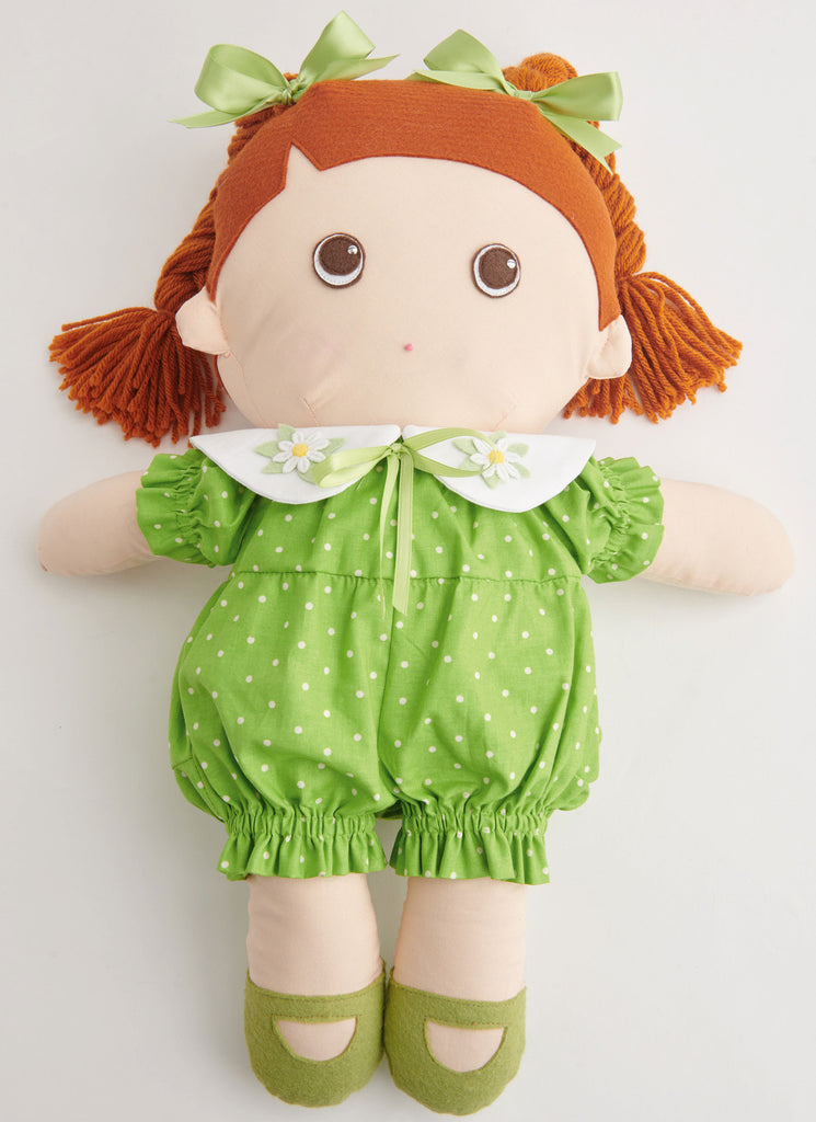 Simplicity S9910 Plush Dolls with Clothes & Pets by Elaine Heigl Designs is a sewing pattern for 18" (46cm) soft dolls and 7" (18cm) plush pets. The dolls feature easy-to-sew body shapes, felt and yarn hair options, appliquéd shoes and eyes, and embroidered facial details. Outfits include pull-on dresses with contrast bloomers or a jumpsuit with elasticized edges. Plush pet designs include a bunny, kitty, and puppy with ribbon bows, felt ears, and chain leashes that can attach to the dolls’ wrists. Perfect for handmade gifts, heirloom toys, or collectible keepsakes.