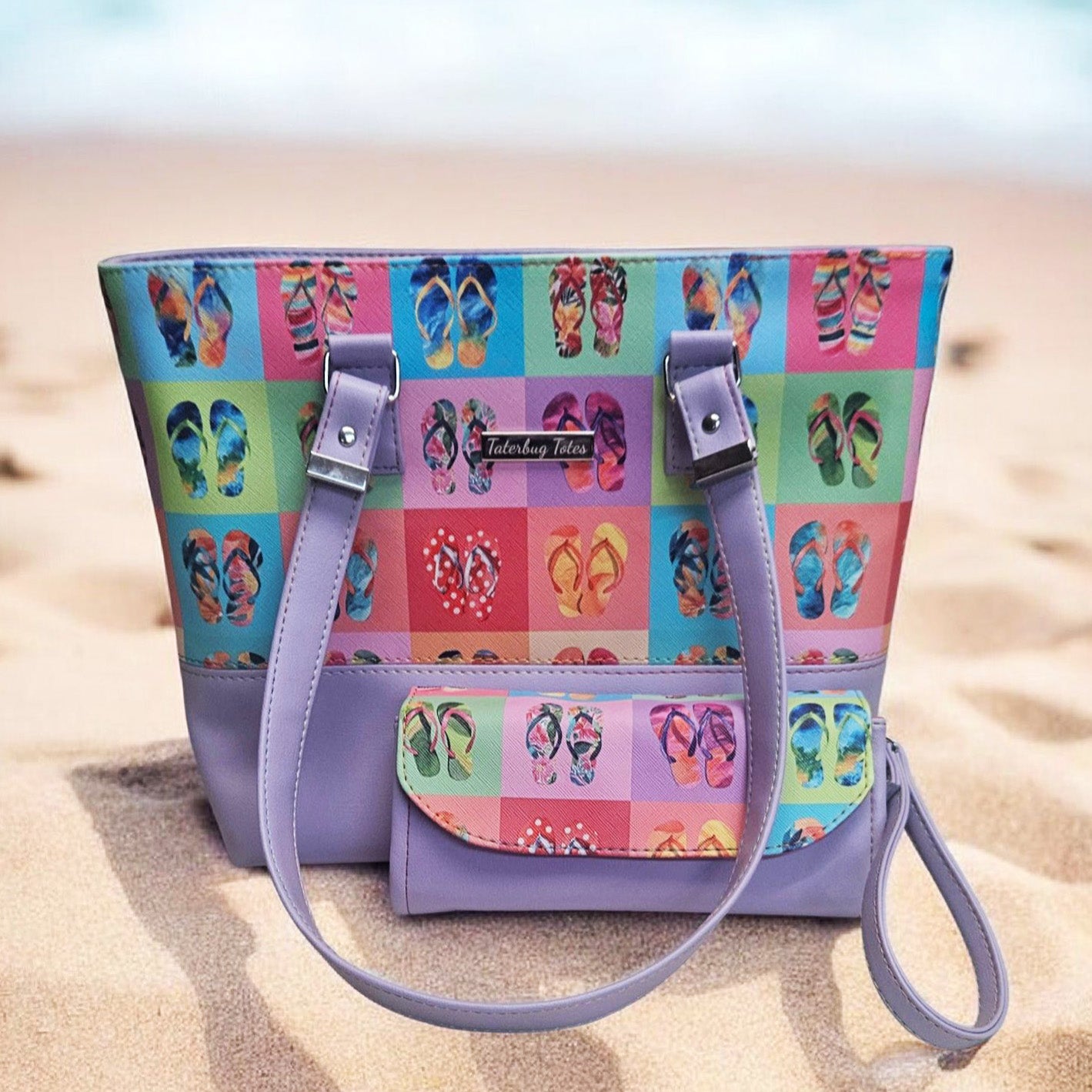 | Design | Watercolor flip-flops in bold summer hues arranged in a colorful grid pattern |