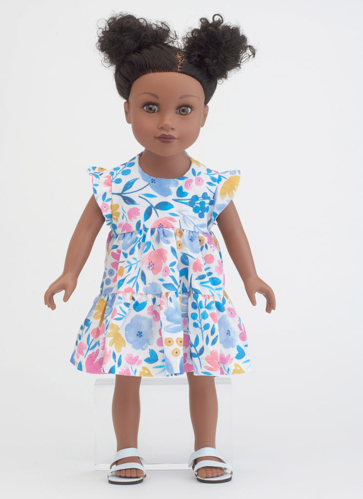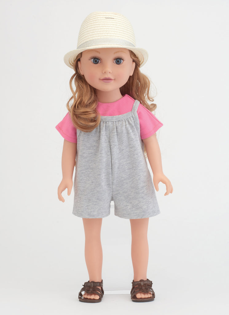 Simplicity S9500 18" Doll Clothes builds a modern mix-and-match wardrobe for 18" (46 cm) dolls. All garments use back hook-and-loop closures for easy dressing. Make a sleeveless jumpsuit, knit athleisure set, sweatshirt dress, tiered ruffle dress, a shorts romper with tee, and pull-on shorts with tee.