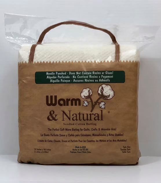 This Twin Size 72"X90" Warm & Natural Cotton Batting is crafted with 100% USA grown cotton that has been punched with hundreds of needles through a thin base material of polymer fibers. This process prevents tearing, shifting, migrating, or creeping through the cover fabric. With a composition of 87.5% cotton and 12.5% polymer fibers, this batting offers flexibility and durability both indoors and outdoors. The fibers are held together without glue, allowing a quilting needle to glide easily through the material. No need to pre-wash, this batting is machine washable after quilting and can even be used as an exterior fabric. Quilt up to 10 inches apart and enjoy easy dyeing while your fabric clings to the batting during quilting. Made in the USA, this product is a game-changer for quilting projects.