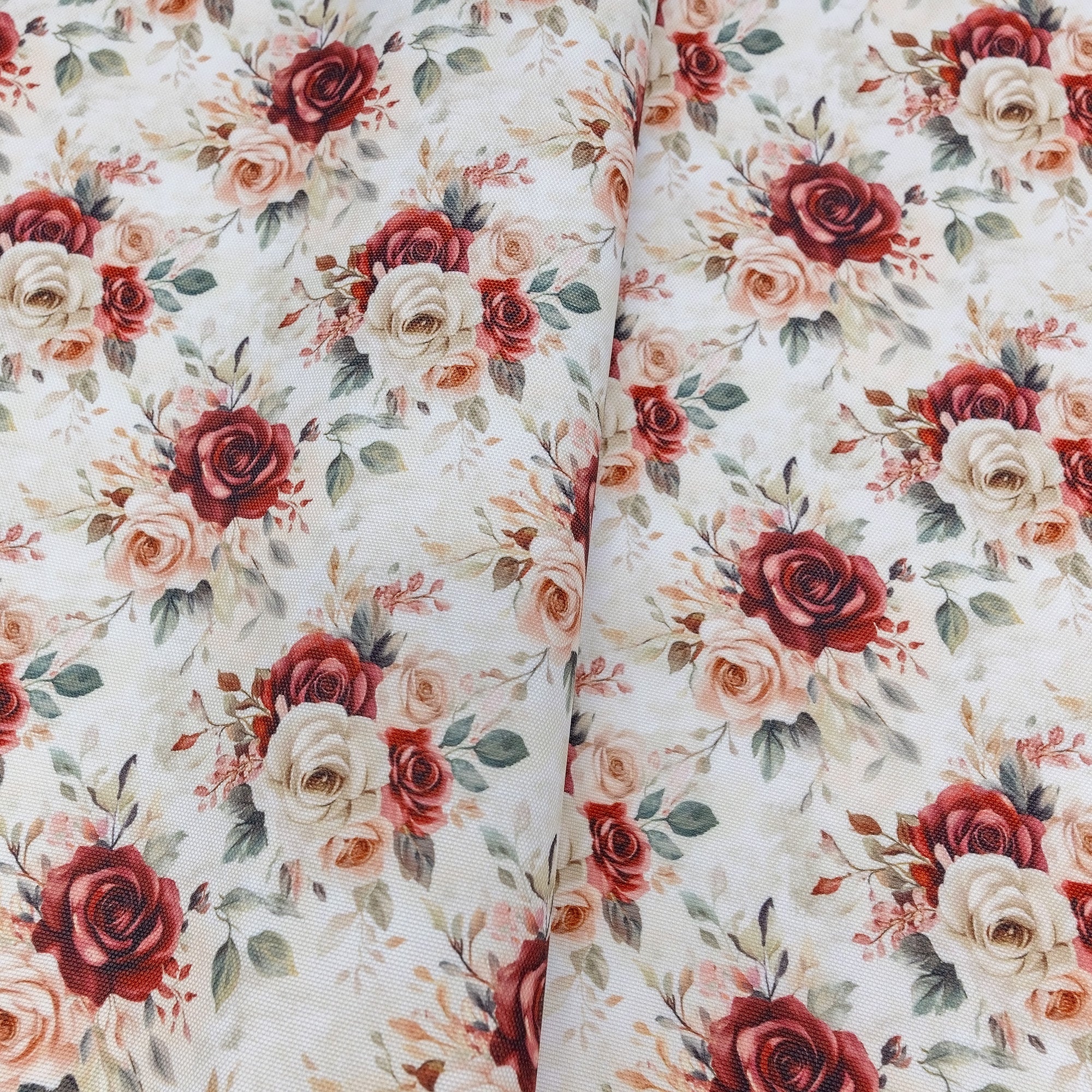 Burgundy Bloom Water-Resistant Canvas combines rich, classic florals with a soft, painterly style. Deep burgundy and cream roses are layered with dusty greenery and blush accents on a light, textured background. The vintage-inspired look makes this fabric ideal for heirloom-style bags, totes, and accessories.