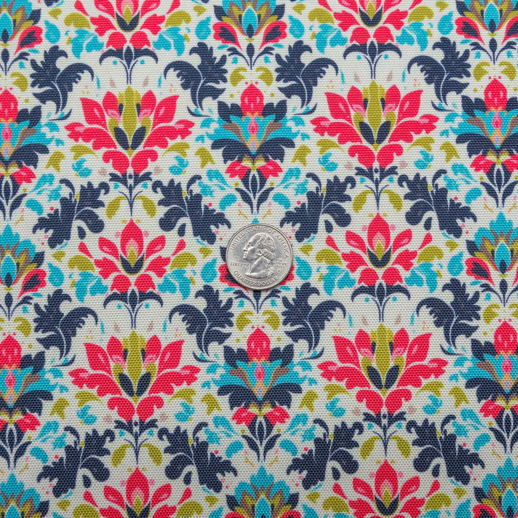 Add a splash of vintage flair to your bag-making projects with Retro Demask Water-Resistant Canvas. This bold print features a colorful damask pattern in red, black, teal, and mustard on a warm ivory background. The retro styling adds character to your projects while the durable canvas structure ensures long-lasting performance.