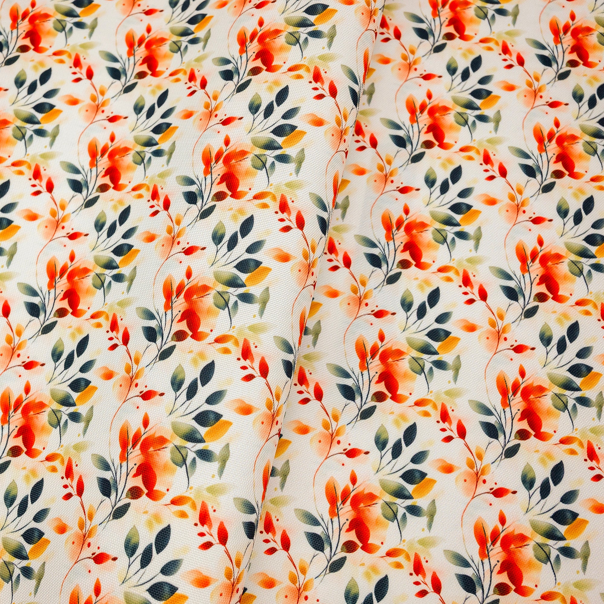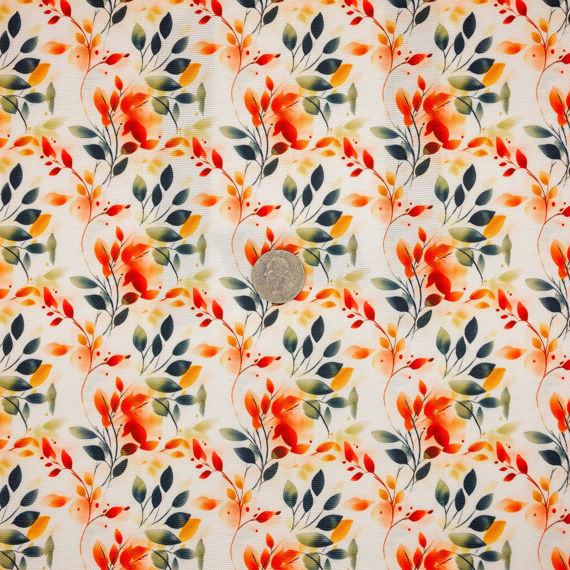 Soft and organic, Cozy Canopy Water-Resistant Canvas drapes autumn leaves in shades of burnt orange, gold, olive, and charcoal over a cream background. The flowing design captures a warm, seasonal feel for handmade bags and accessories. Made from 600 denier PU-coated polyester, it provides strong structure and moisture resistance without interfacing.