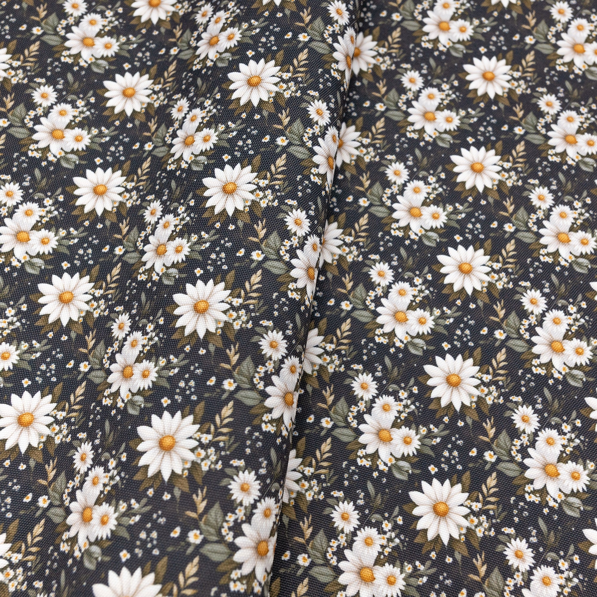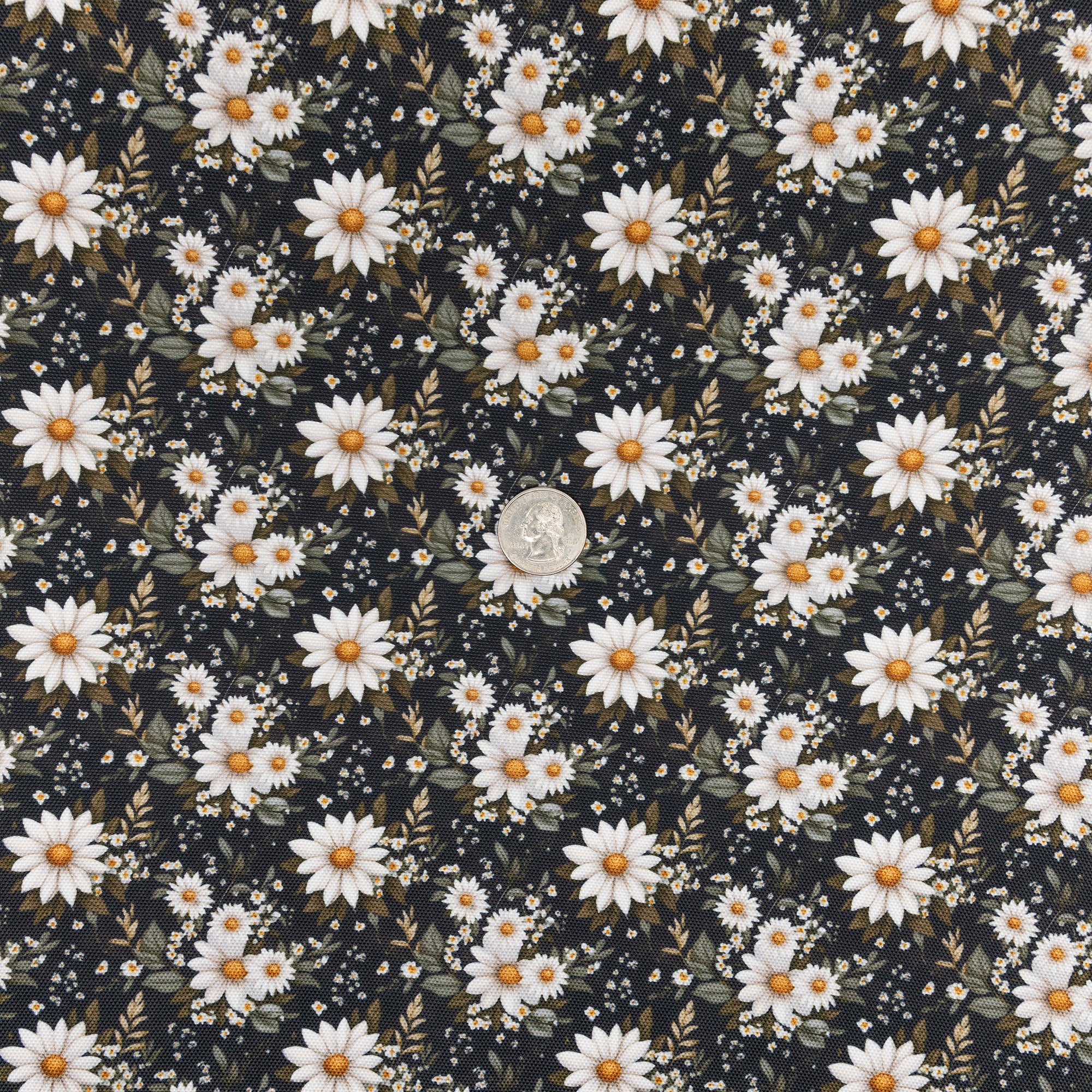 Daisy Dusk Water-Resistant Canvas blends moody florals with vintage charm. Creamy white daisies and soft golden accents are scattered across a deep espresso-brown background, with muted olive leaves and delicate filler blooms for extra texture.