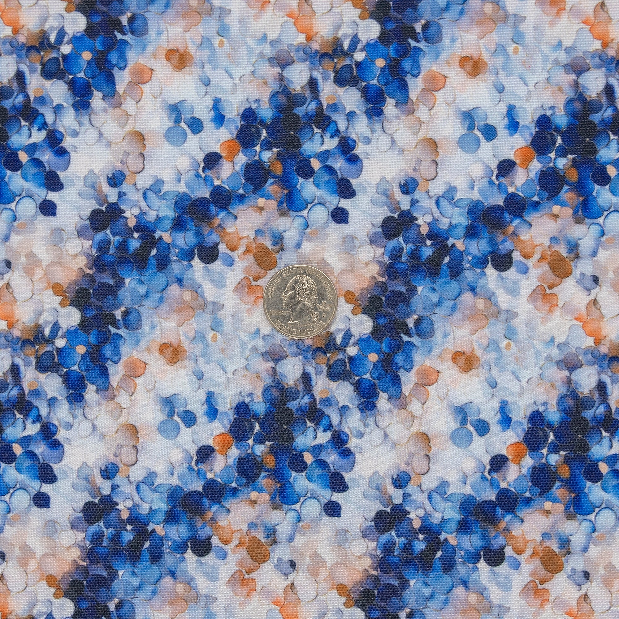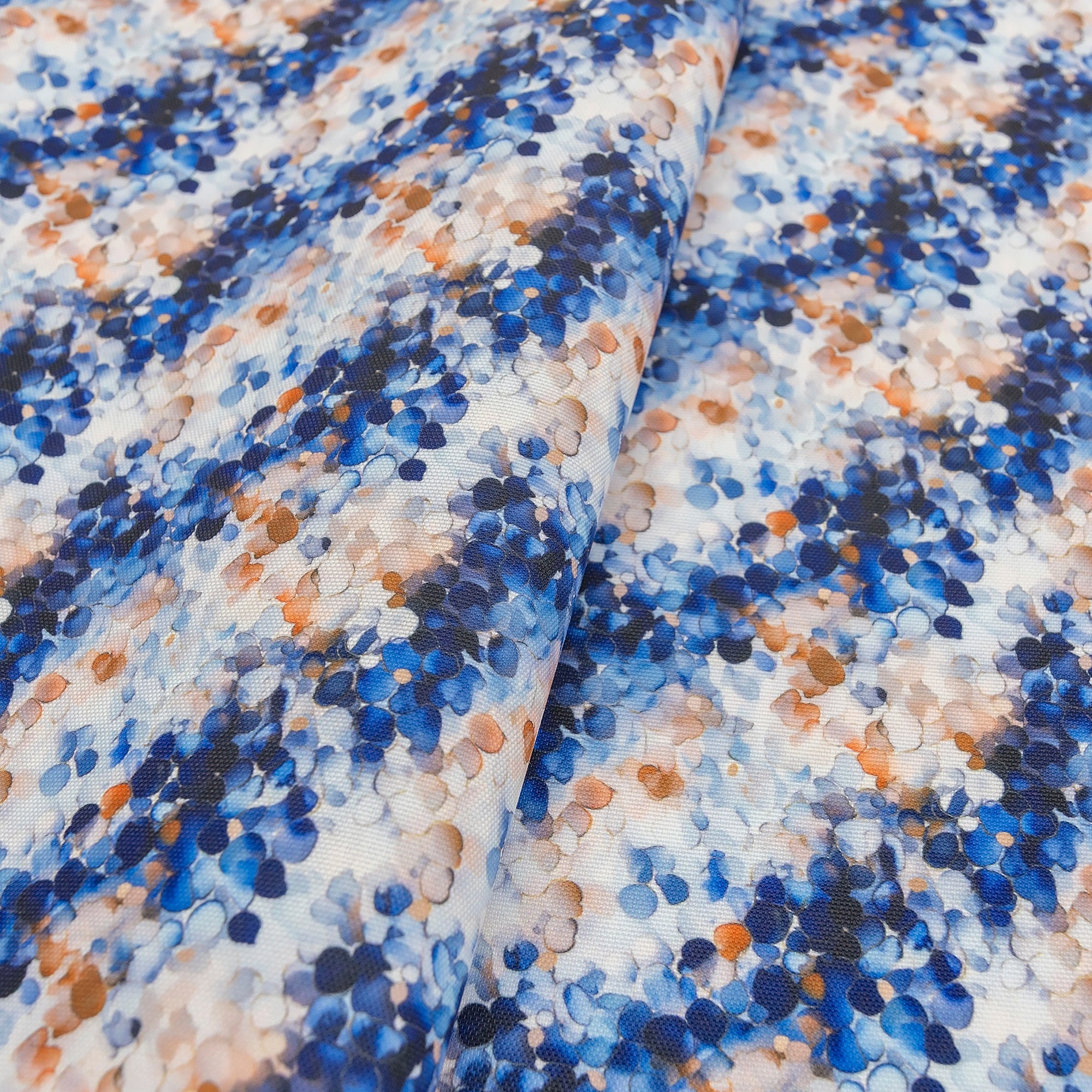 Modern and versatile, Indigo Pebbles Water-Resistant Canvas showcases scattered pebble-like shapes in navy, bronze, and ivory. The abstract design adds texture and depth, perfect for sleek contemporary bags. Its 600 denier PU-coated polyester structure offers excellent shape retention and light water resistance—no interfacing needed.