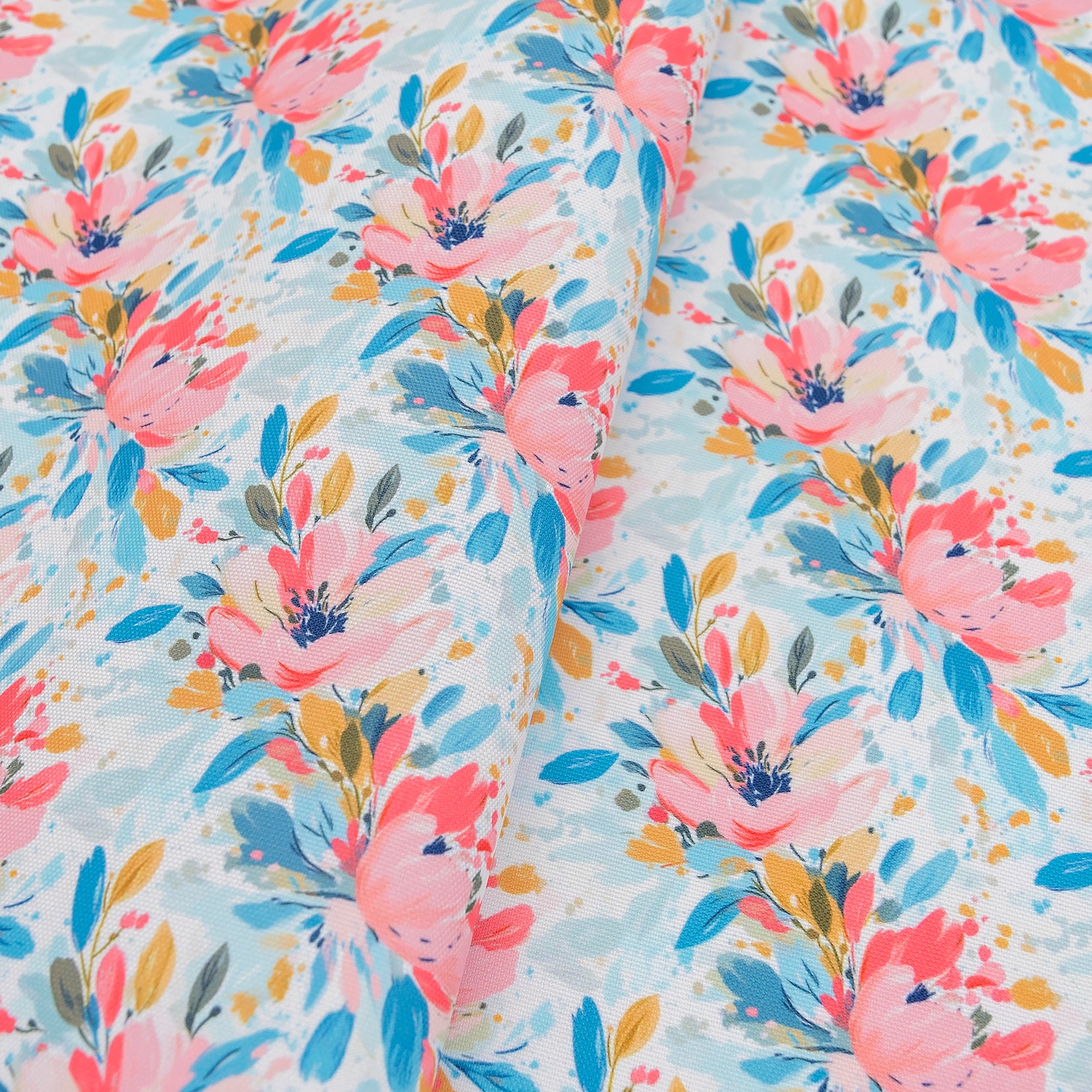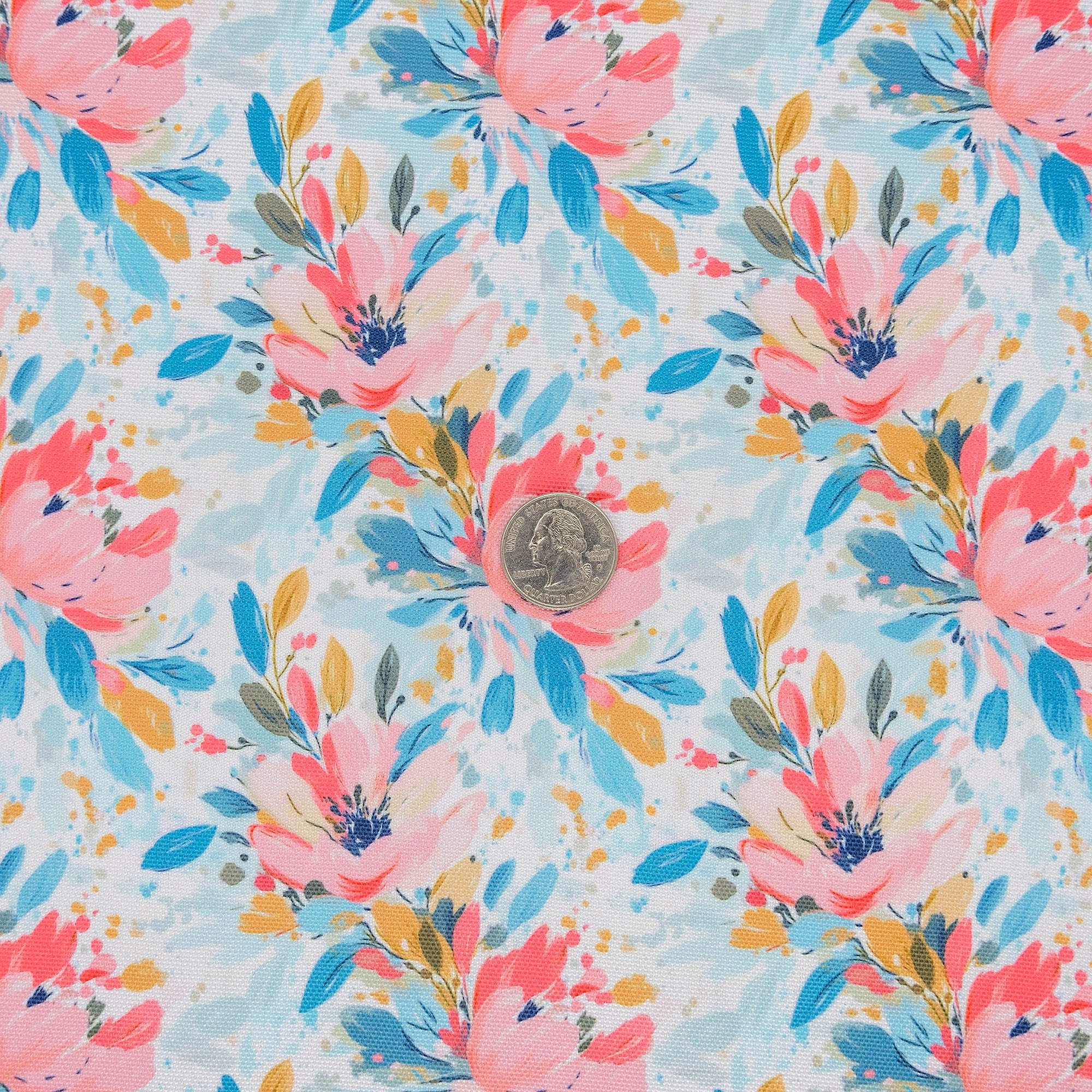 Add an artistic touch to your bags with Painted Petals Water-Resistant Canvas. This expressive floral features loose, hand-painted strokes in coral, teal, mustard, and ivory, set against a soft speckled background. It’s bold without being overpowering, and the PU-coated 600 denier canvas provides strong, stable structure.