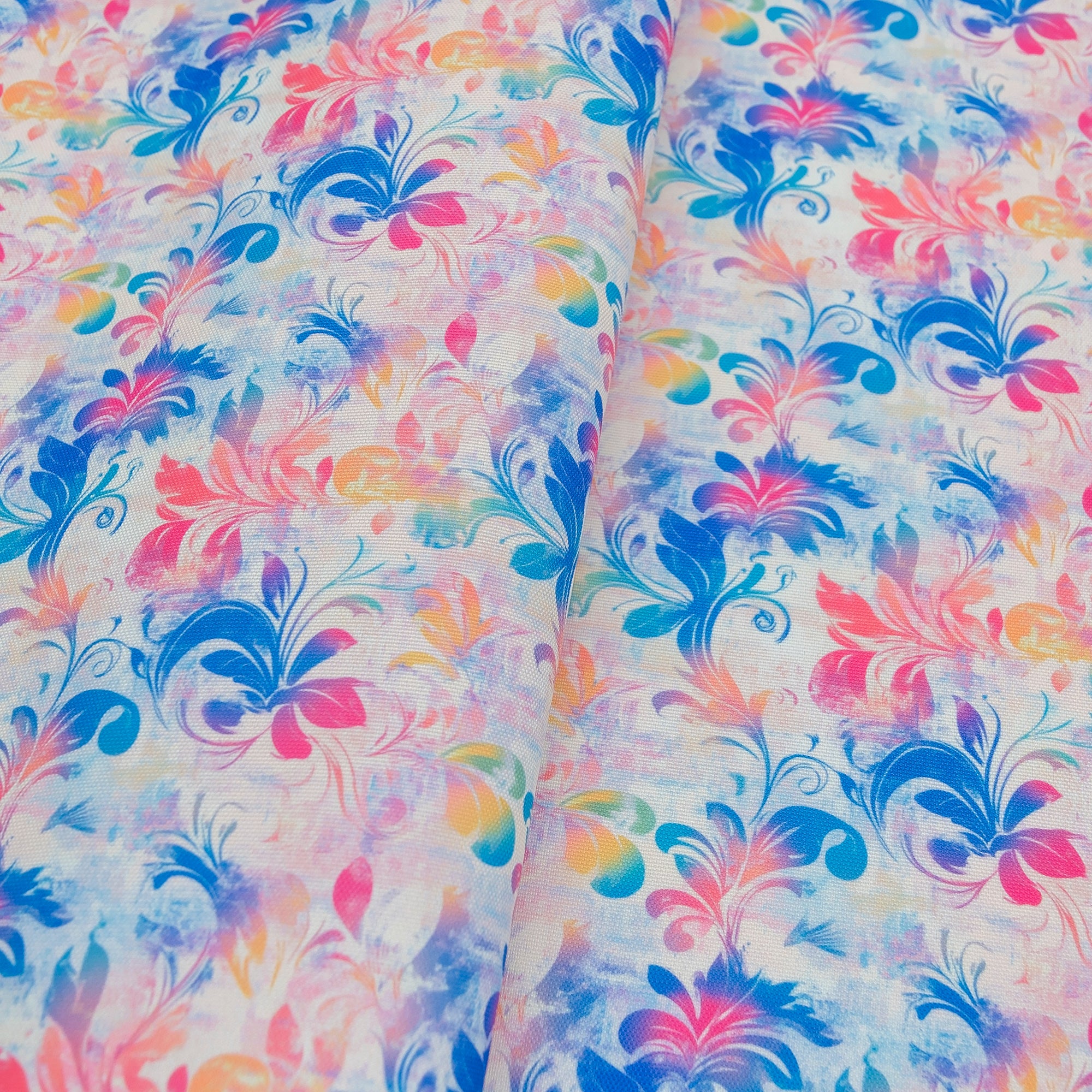 Let your creativity swirl with Rainbow Swirl Water-Resistant Canvas. This bold design features baroque-style scrolls in a mix of pinks, blues, purples, and yellows with a distressed texture background. Ideal for vibrant statement bags, this 600D canvas offers structure, water resistance, and zero need for interfacing.