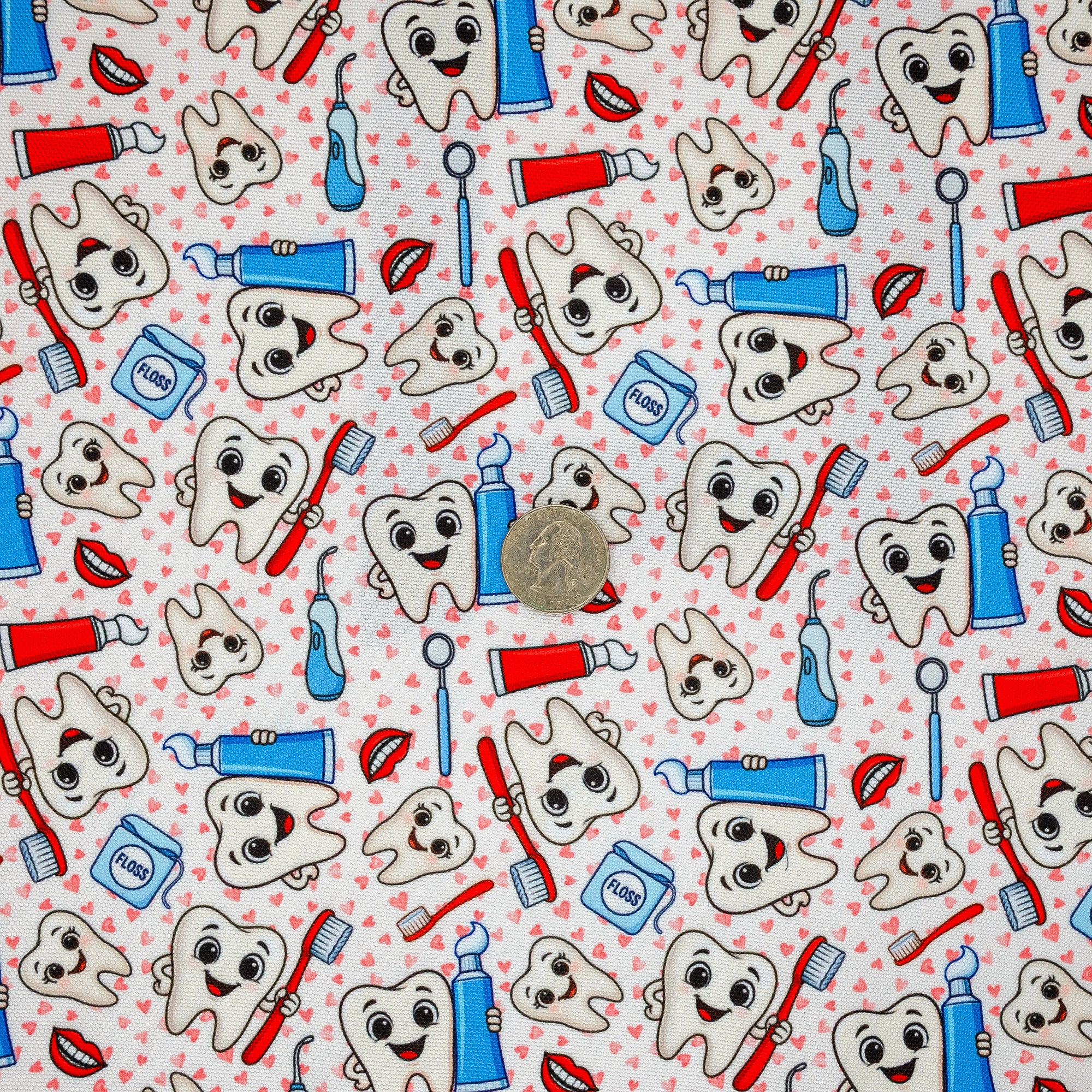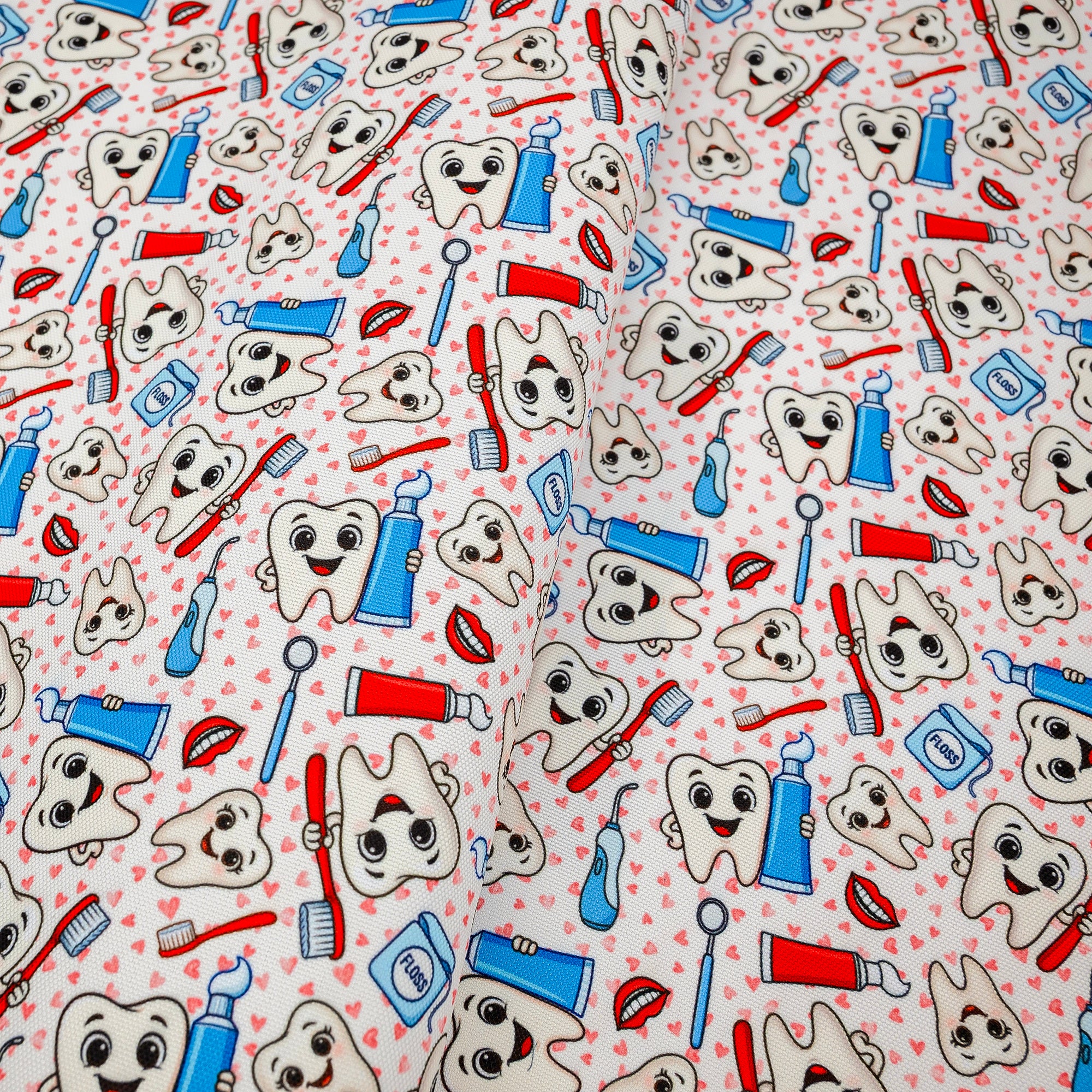 Playful and fun, Smile Squad Water-Resistant Canvas features cheerful tooth characters, toothbrushes, toothpaste, and bright red lips on a soft cream background. This dental-inspired print is perfect for dental hygienist, assistants and dentists. Made from 600 denier PU-coated polyester, it offers sturdy structure and moisture resistance with no interfacing needed.