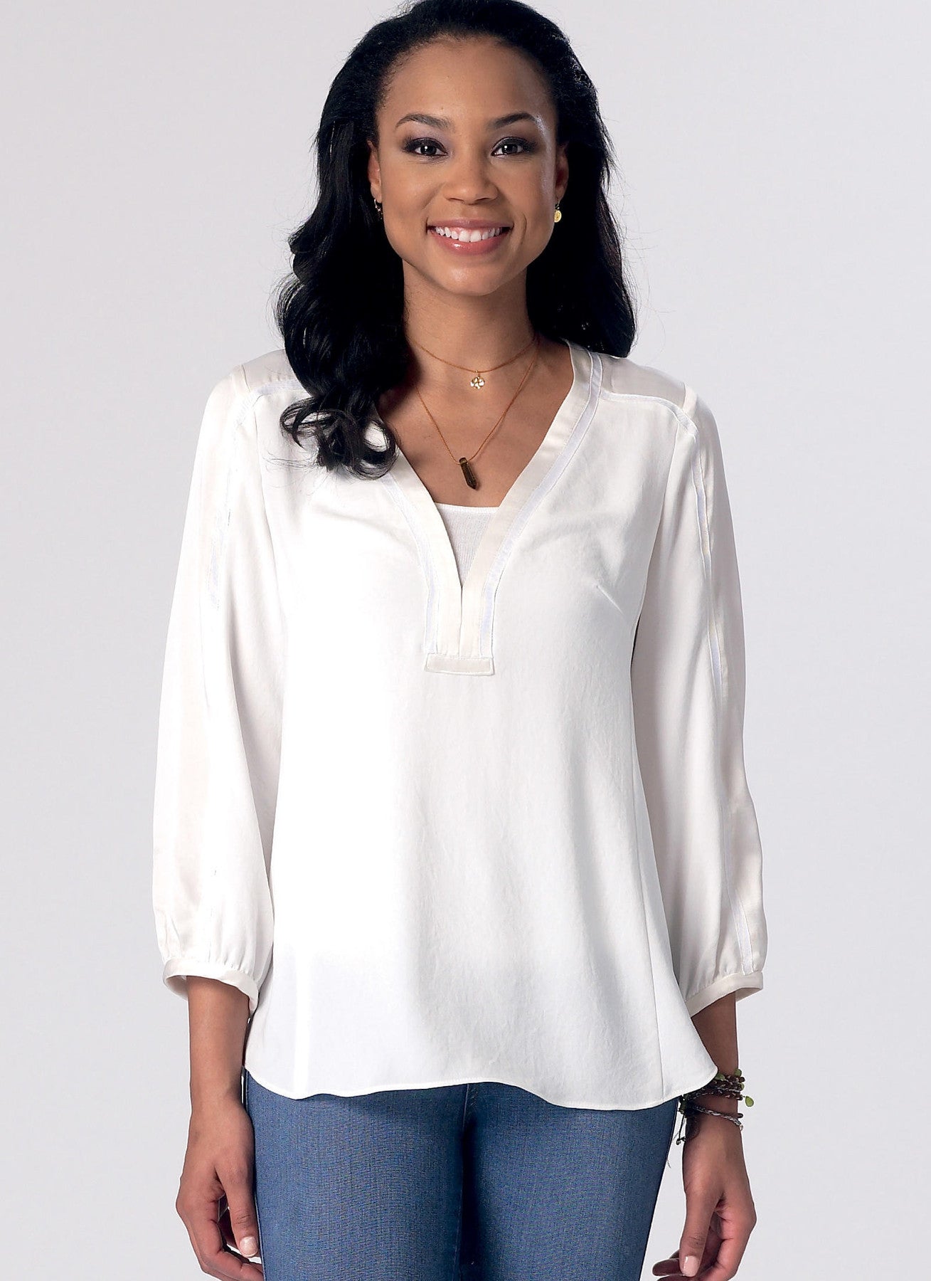 McCall’s M7357 Misses’ Banded Tops with Yoke is an easy woven top pattern. Loose-fitting pullover styles feature a banded neckline, self-lined yokes, applied front tab, shaped hem, and three-piece sleeves. Sew short, three-quarter, or long sleeves, add contrast panels, or trim View C as shown.