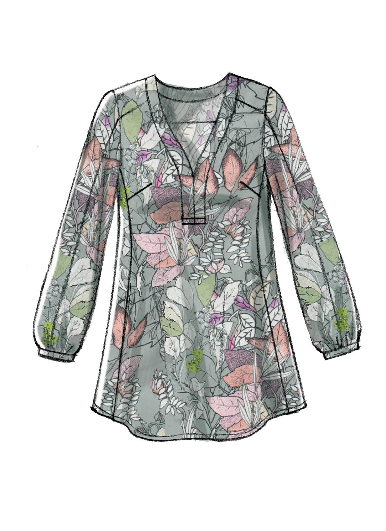| Views Included | Views A–D: A short sleeves with contrast panels; B three-quarter sleeves with front and sleeve side slits; C long sleeves with purchased trim; C, D long sleeves gathered into binding |