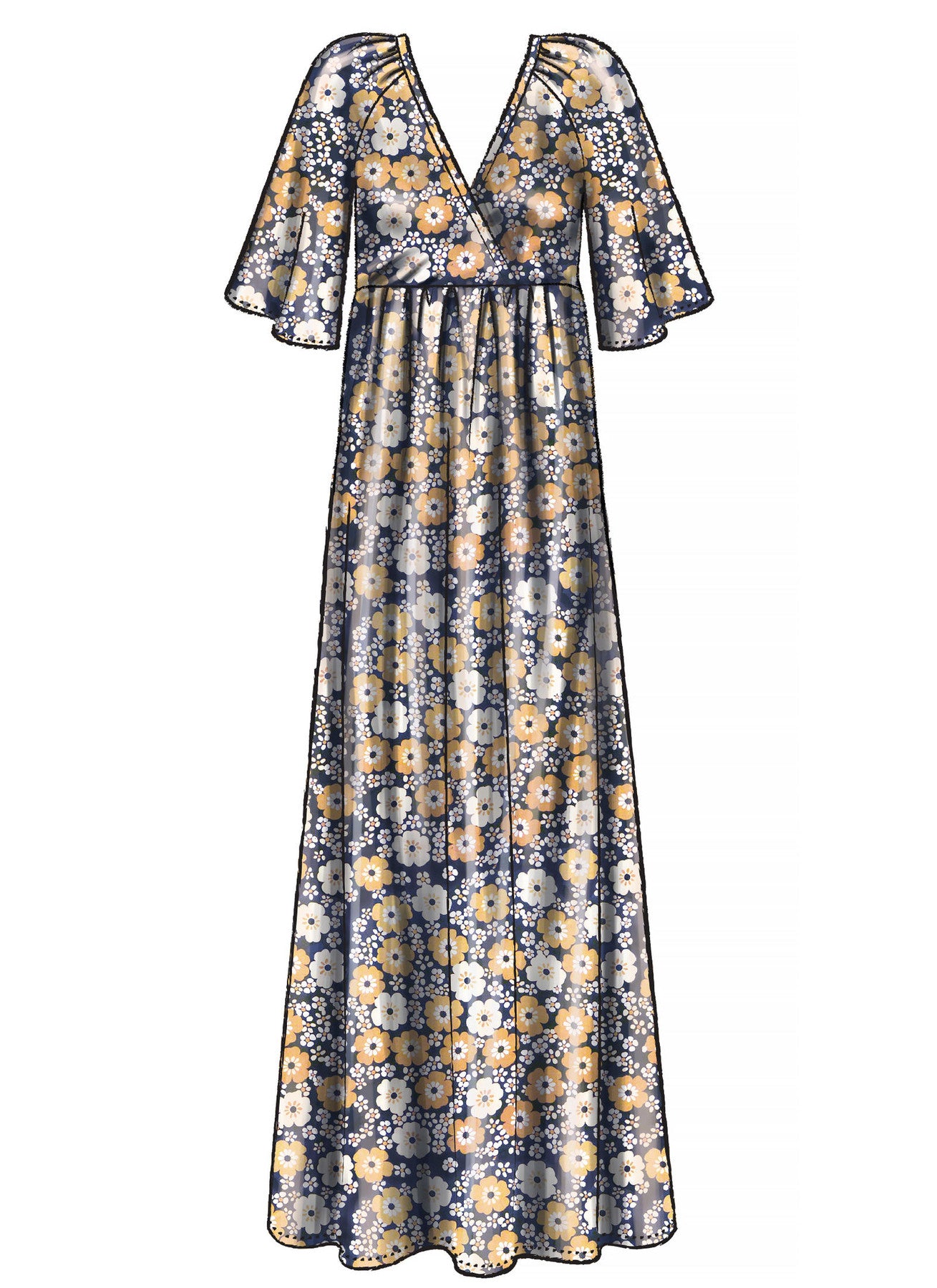 McCall’s M7969 Misses’ Dresses is an easy pullover dress pattern for woven fabrics. Features a V-neck with neck binding, a raised waistline, and sleeve variations. Sew simple or add ruffle details. Choose knee or maxi length.