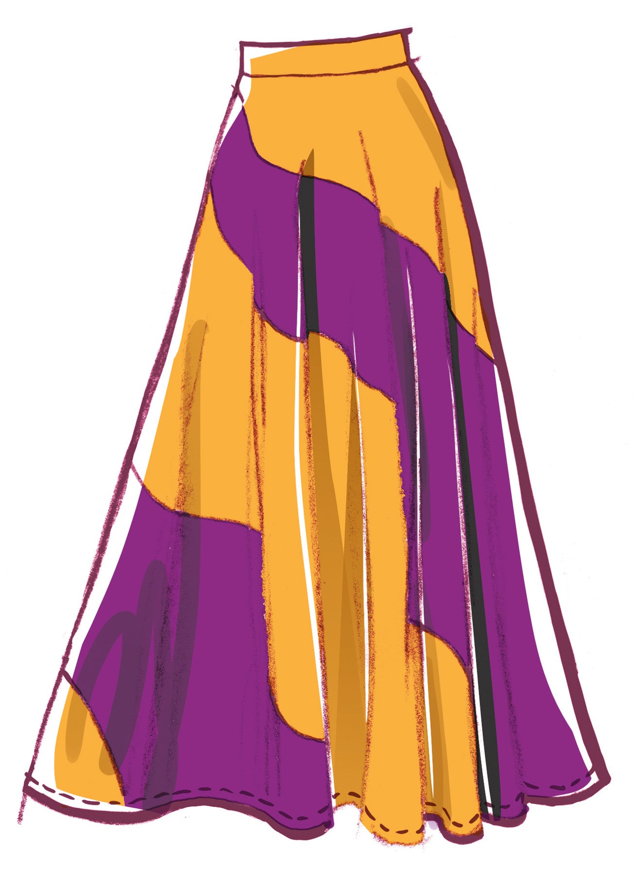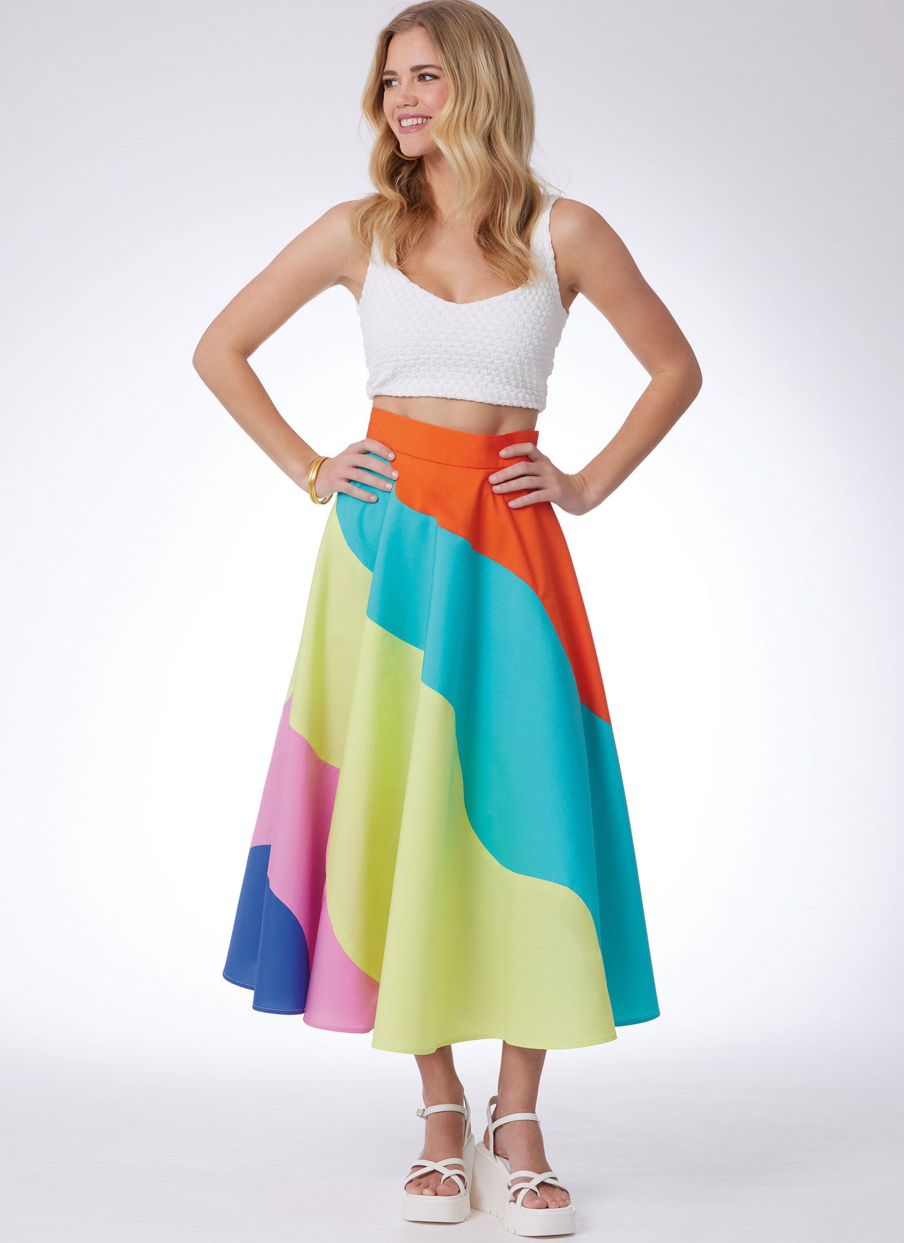 | Views Included | Views A–C: A midi circle skirt with narrow hem; B and C circle skirts with curved seams for contrast or color blocking. All views have waistband, hook-and-bar, invisible zipper |