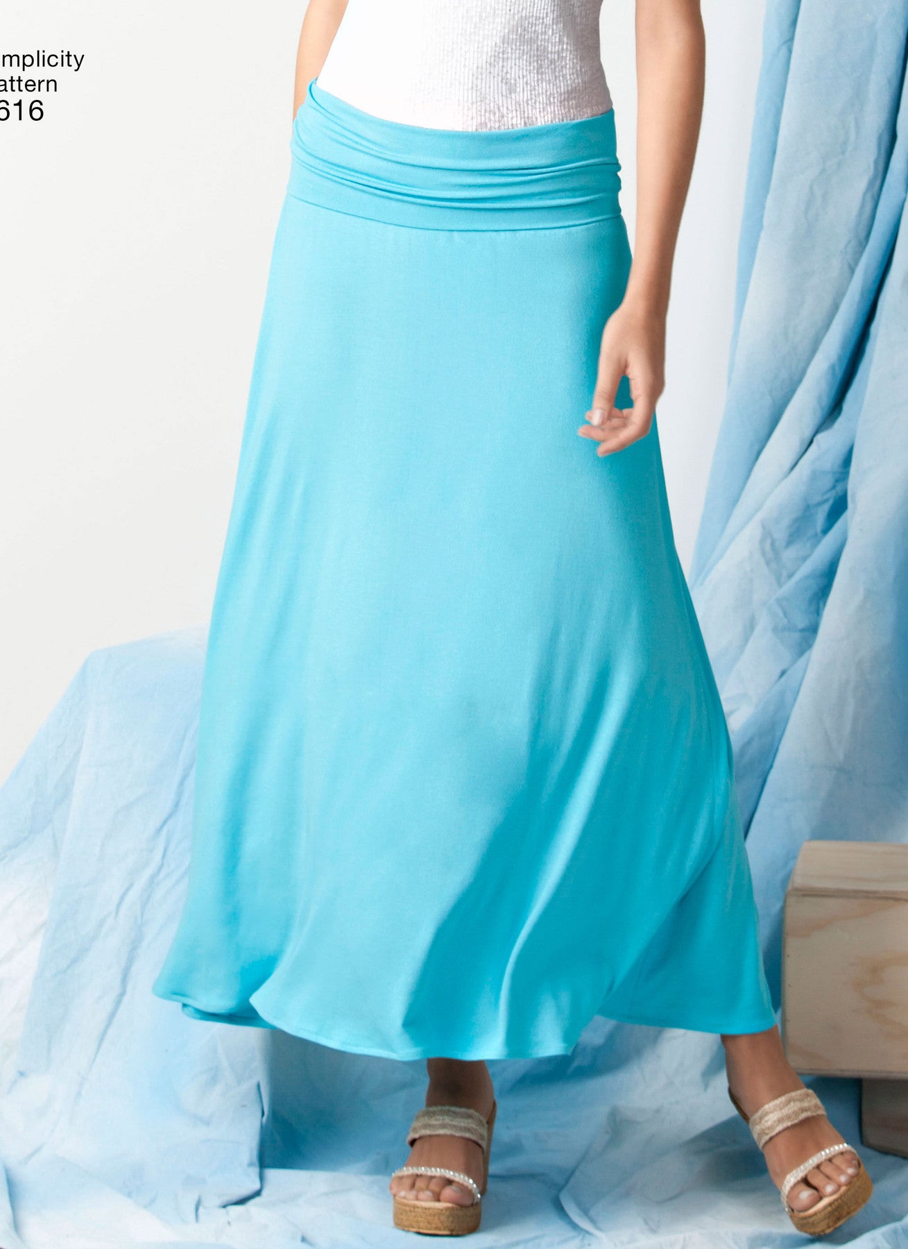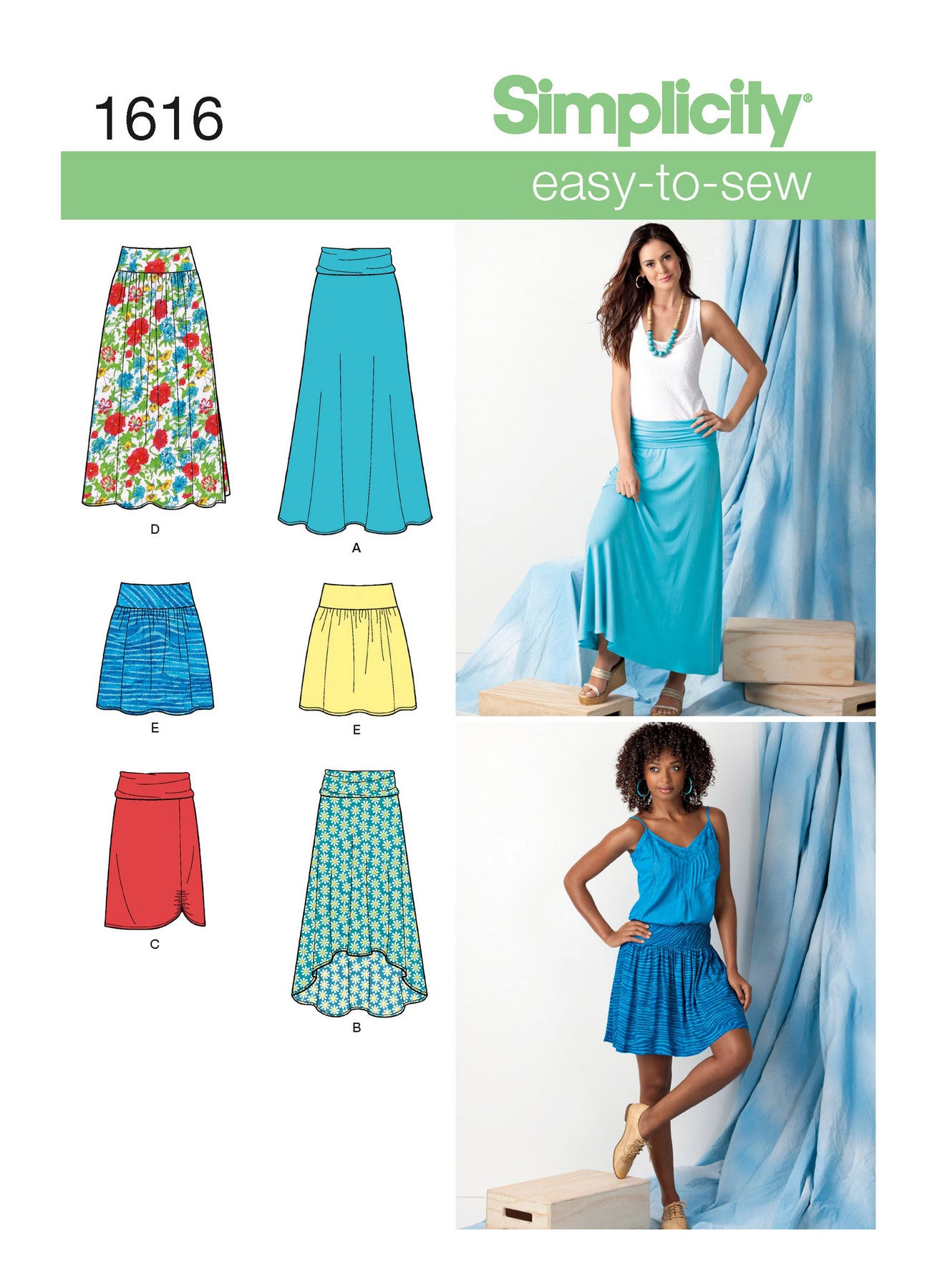 Simplicity S1616 Misses’ Knit or Woven Skirts is an easy sewing pattern with five skirt styles. Choose from a flared maxi, a high-low hem, a straight knee-length skirt with ruching, or gathered skirts with elastic waists. Views A–C are designed for knits, while Views D and E work with woven fabrics. These versatile skirts are comfortable, flattering, and simple to sew.