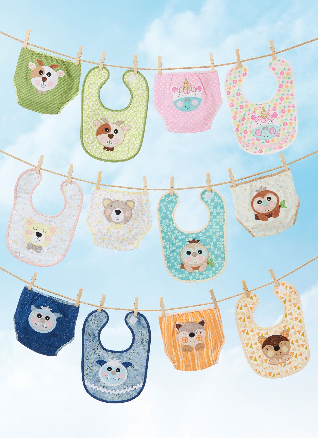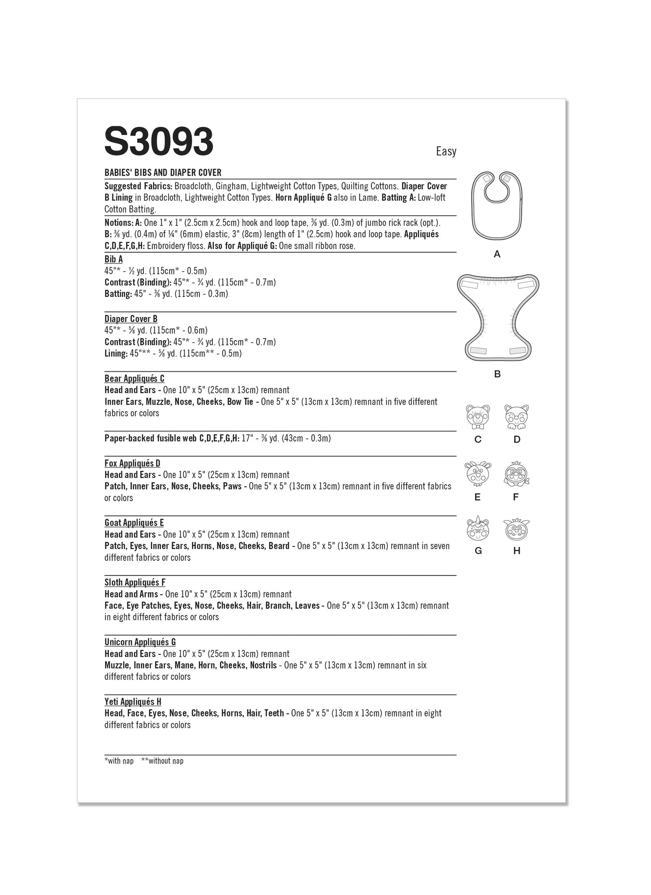 | Views Included | A lightly padded bib with contrast binding, B lined diaper cover with elasticized legs, C–H animal appliques (bear, fox, goat, sloth, unicorn, yeti) |