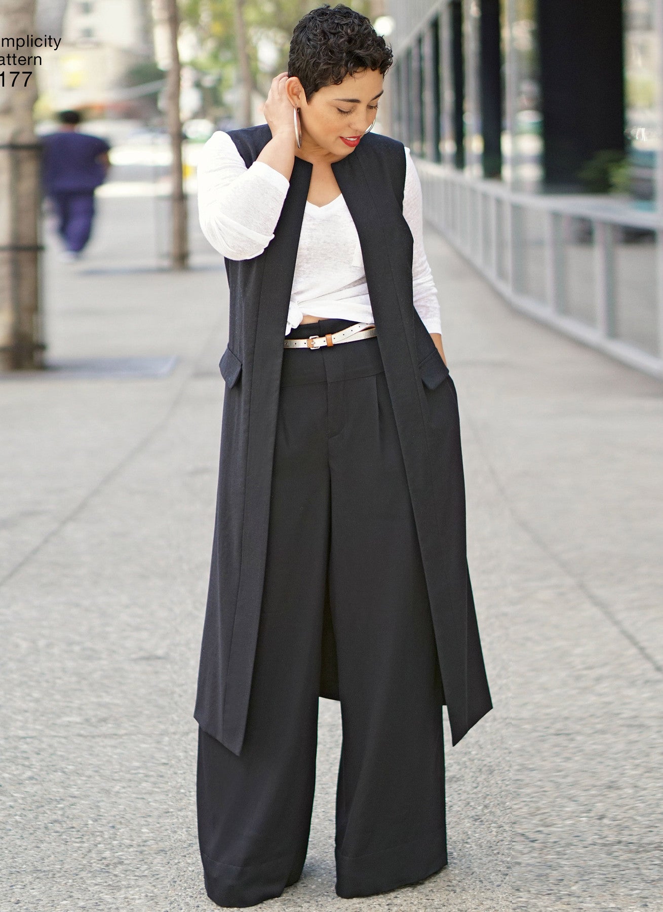 Simplicity S8177 Mimi G Style Pants, Coat/Vest & Knit Top is a modern wardrobe set with wide-leg pants, a V-neck knit top in long or short sleeves, and a duster-length unlined coat or vest. Tops are sized for stretch knits; the pants and outer layers work in crisp wovens. Clean lines, pockets, and a high waistband make these separates easy to mix and match.