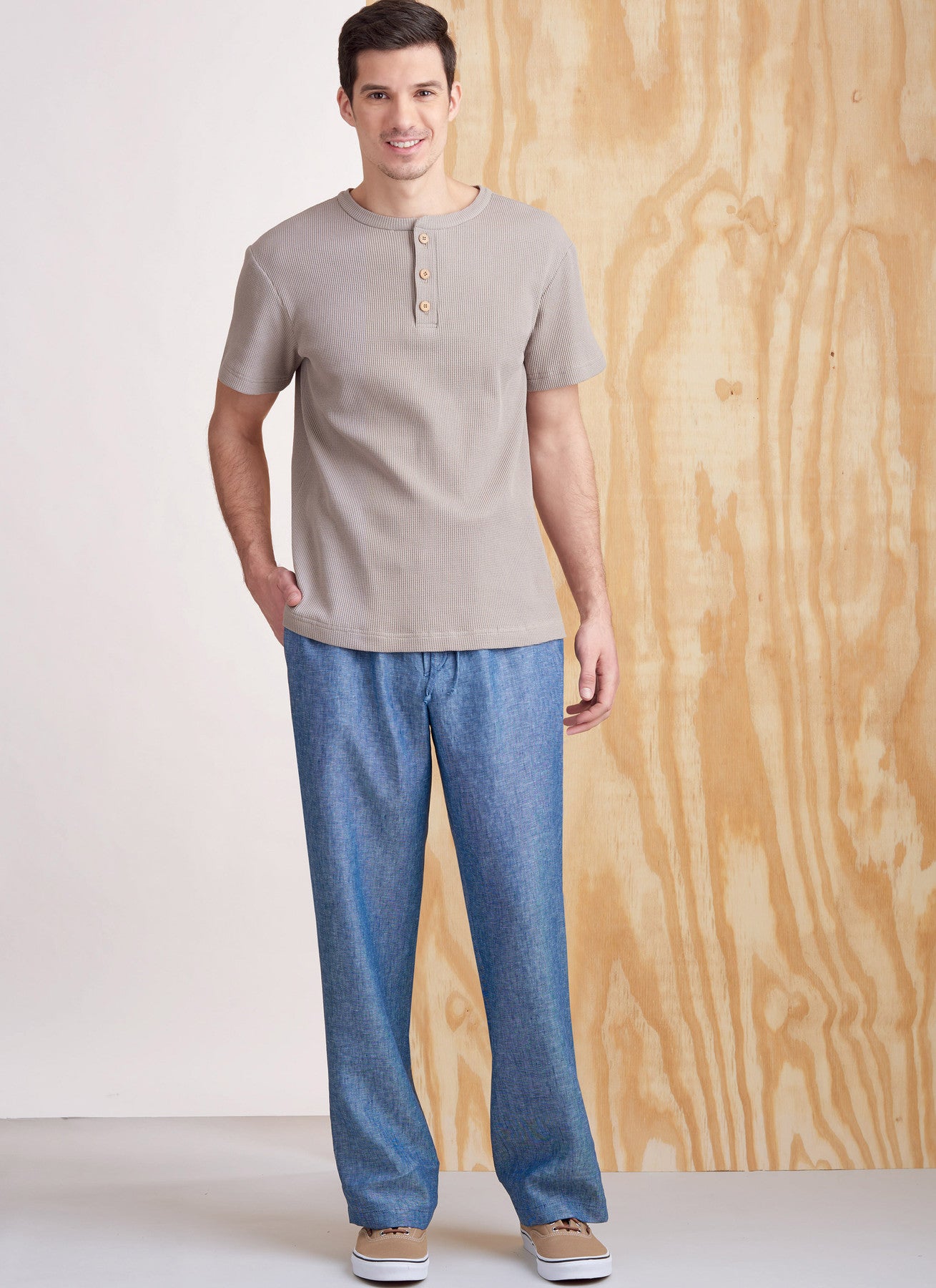 Simplicity S9315 Men’s Knit Tops & Pants is an easy sewing pattern for casual men’s wear. The knit tops feature a buttoned placket and are available in long or short sleeves. The relaxed pants include back elastic, a zipper fly, self ties, and straight legs. Designed for knit tops and woven pants, this versatile pattern is ideal for everyday comfort.