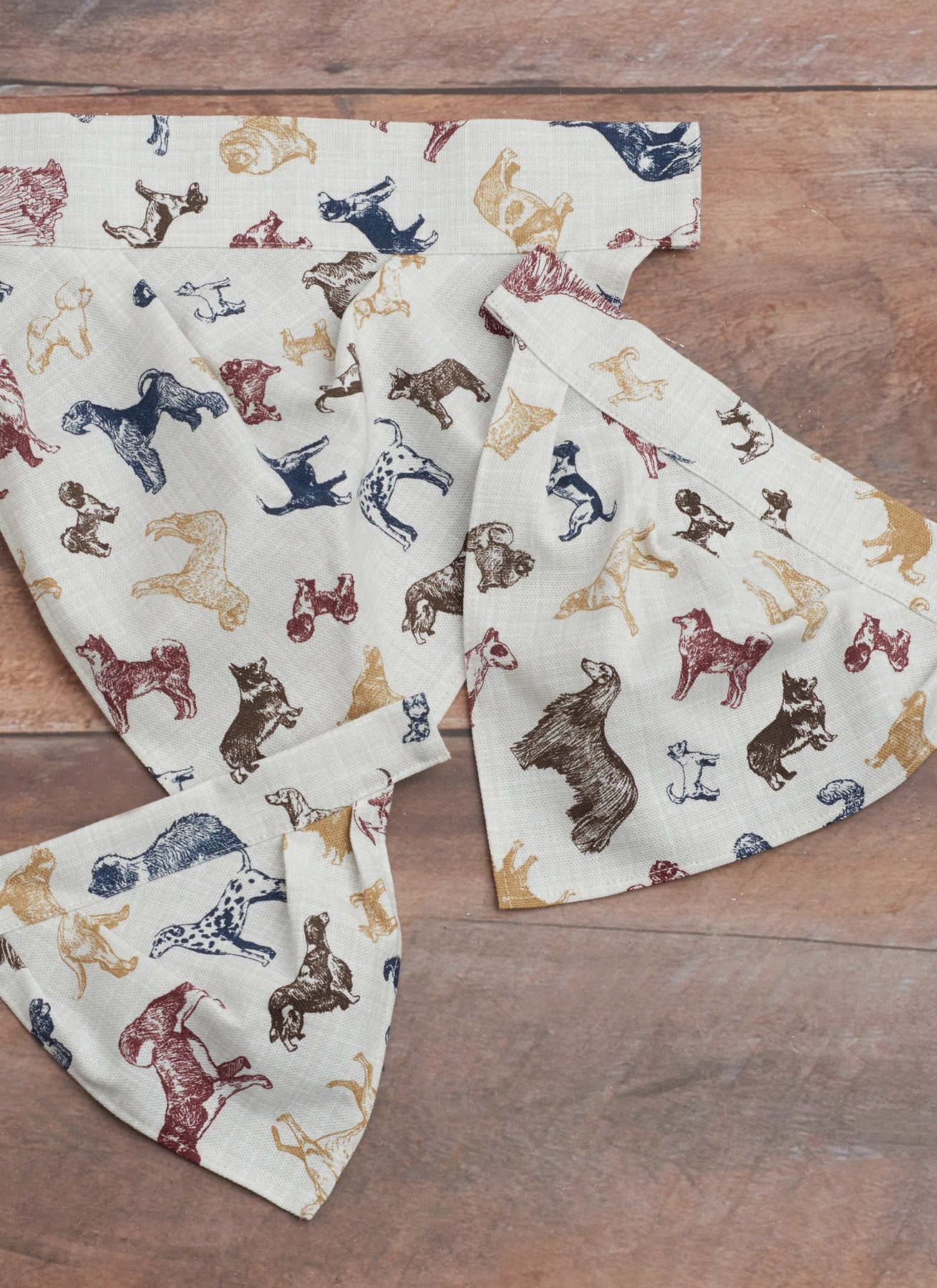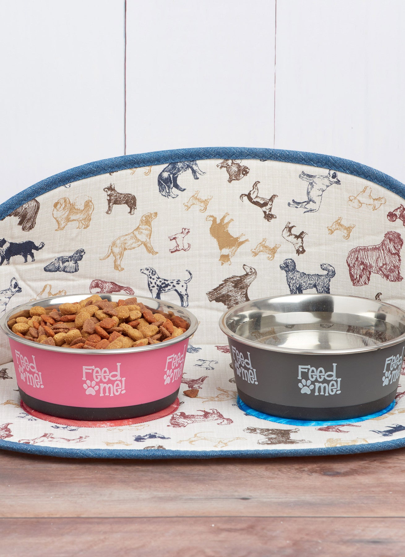 | Views Included | A tailored crate cover with opening flaps (3 sizes); B ruffled crate cover with opening flaps (3 sizes); C non-skid placemat with splash guard and bowl appliqués; D treat/waste-bag pouch with detachable belt and leash loop; E bone appliqués; F bandana-style “gotcha” scarf that slides over the collar |