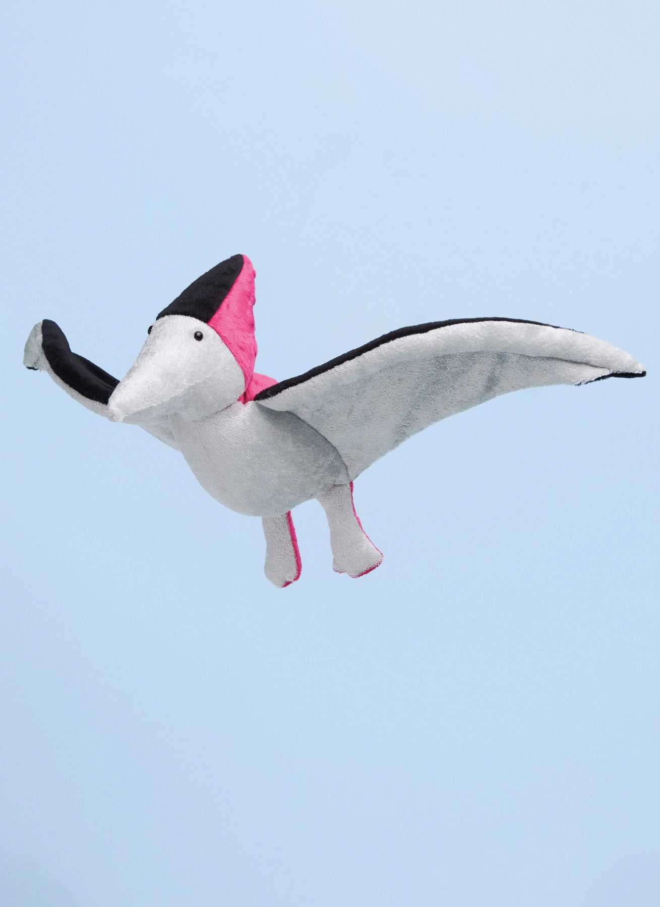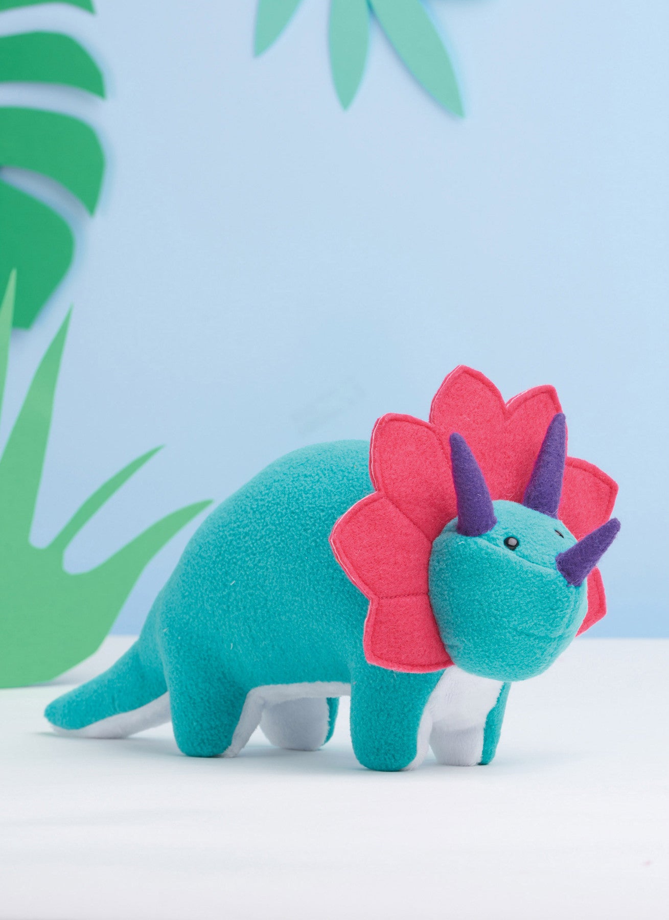 | Views Included | A triceratops with felt horns and ruff, B standing dino with contrast belly, C long-neck dino, D stegosaurus with back plates and tail spikes, E flying pterosaur |
