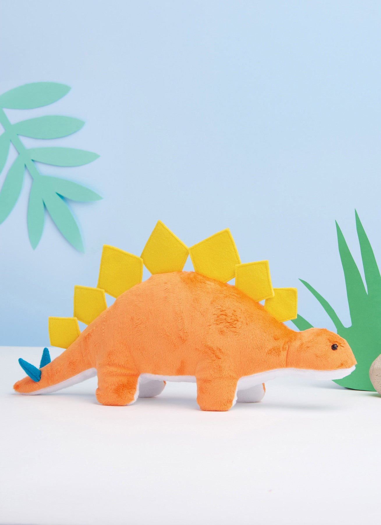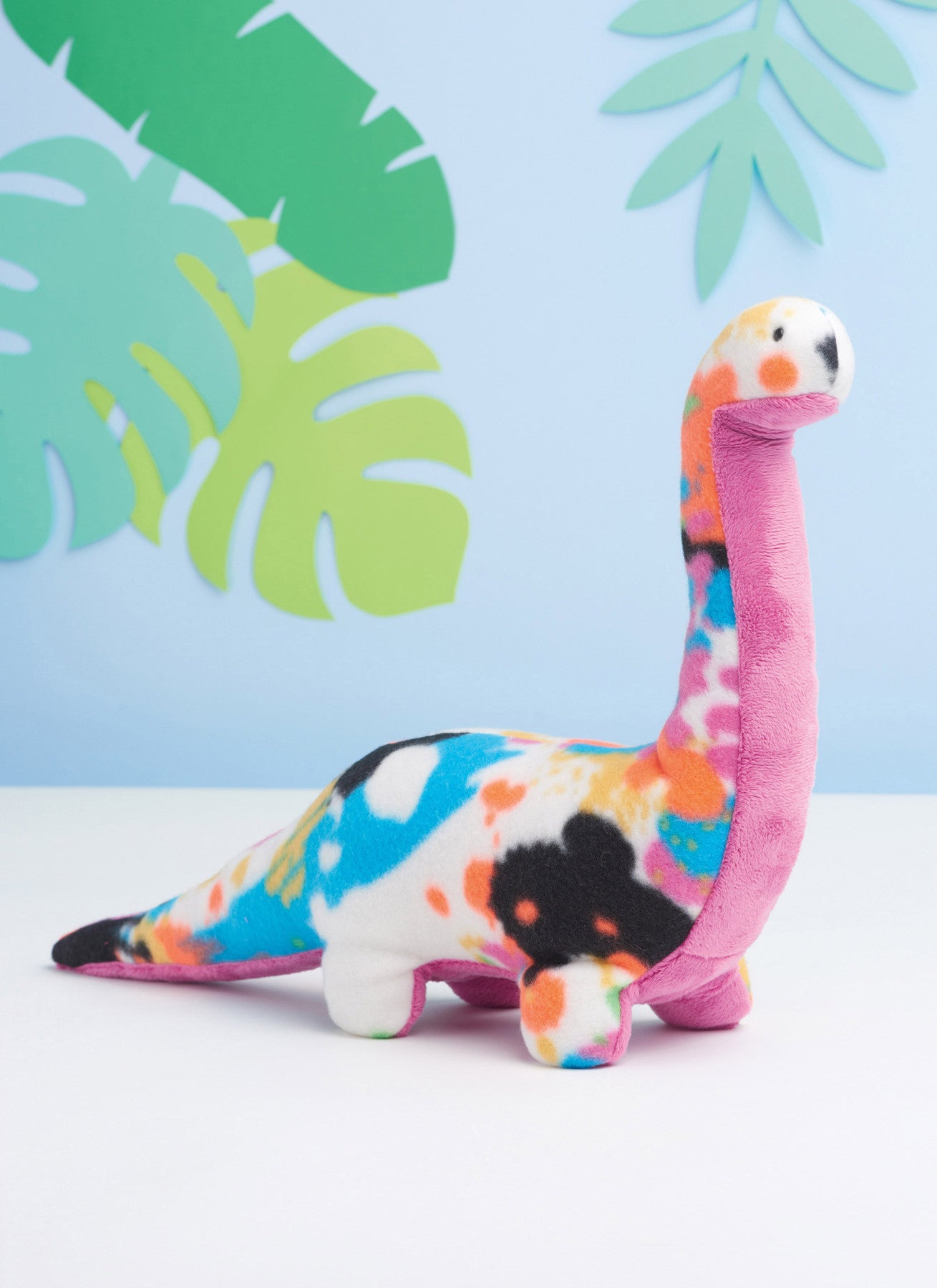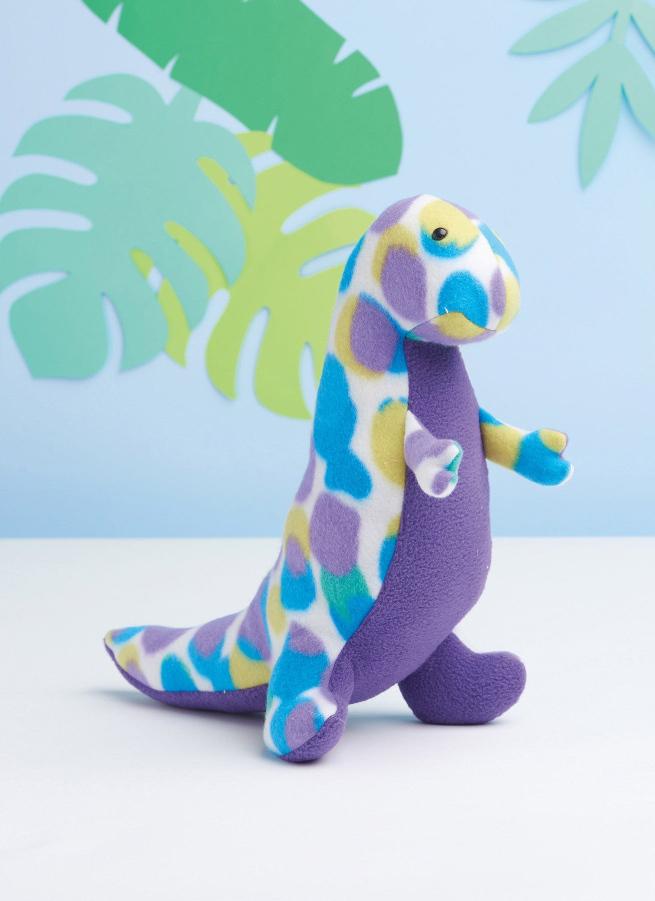 Simplicity S9585 Plush Dinosaurs is an easy stuffed animal sewing pattern designed for fleece, minky, or velour. Create soft, colorful dinosaurs in multiple shapes and sizes with simple body pieces, contrast bellies, felt spikes, horns, and safety eyes. Each dinosaur ranges from 9" to 21" long, making them perfect for gifts, craft fairs, or cozy nursery decor.