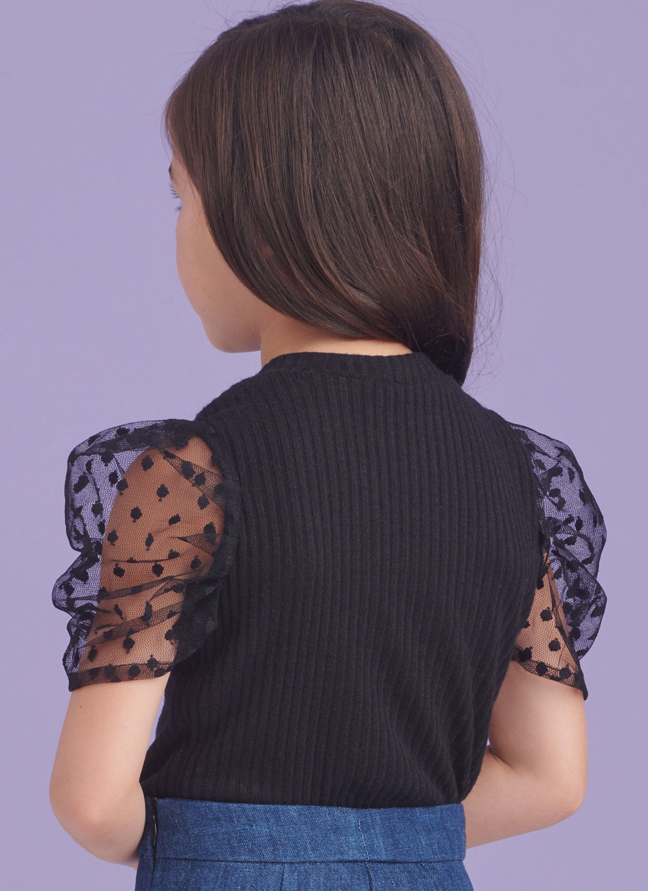 Simplicity S9863 Children’s & Girls’ Knit Tops and Pants is a versatile sewing pattern designed for stylish everyday wear. The knit tops feature long or short sleeves, with options for dramatic gathered sleeves or simple banded hems. The pants include a flared leg design with side seam pockets and an invisible zipper. Ideal for mixing stretch knits with contrast fabrics like chiffon, lace, or lightweight denim, this pattern offers creative outfit combinations for children and girls.