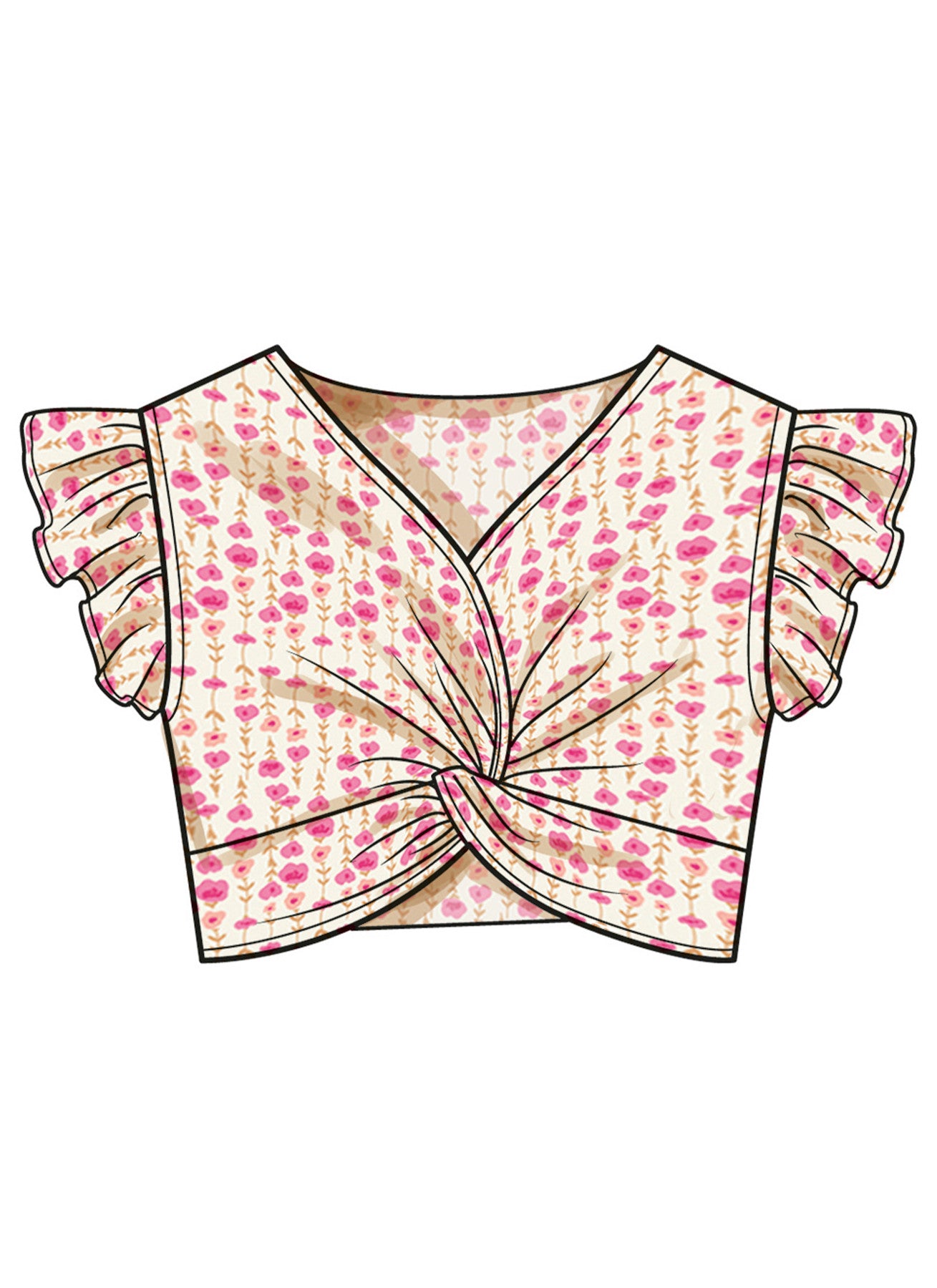 | Views Included | View A twist-front knit top with ruffle sleeves, View B shorts with self-tie bow, View C pants with elastic waist and pockets, View D wide-brim hat |