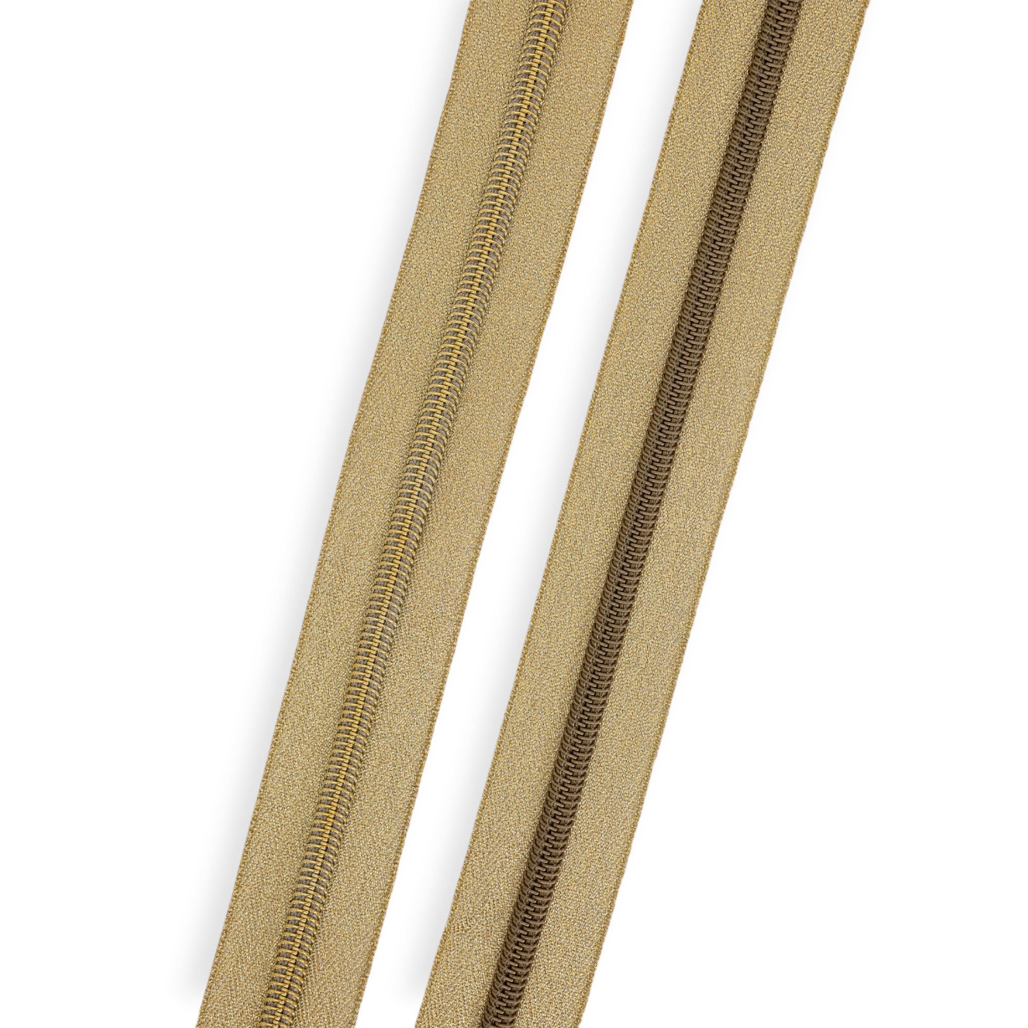 Give your makes a luxe finish. This #5 Nylon Zipper Tape combines a gold metallic tape with a matching light gold or antique brass metal-look coil—shiny like metal, flexible like nylon.