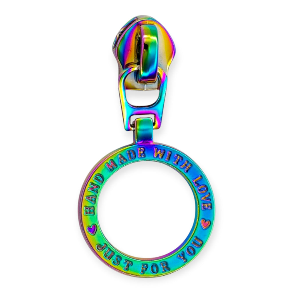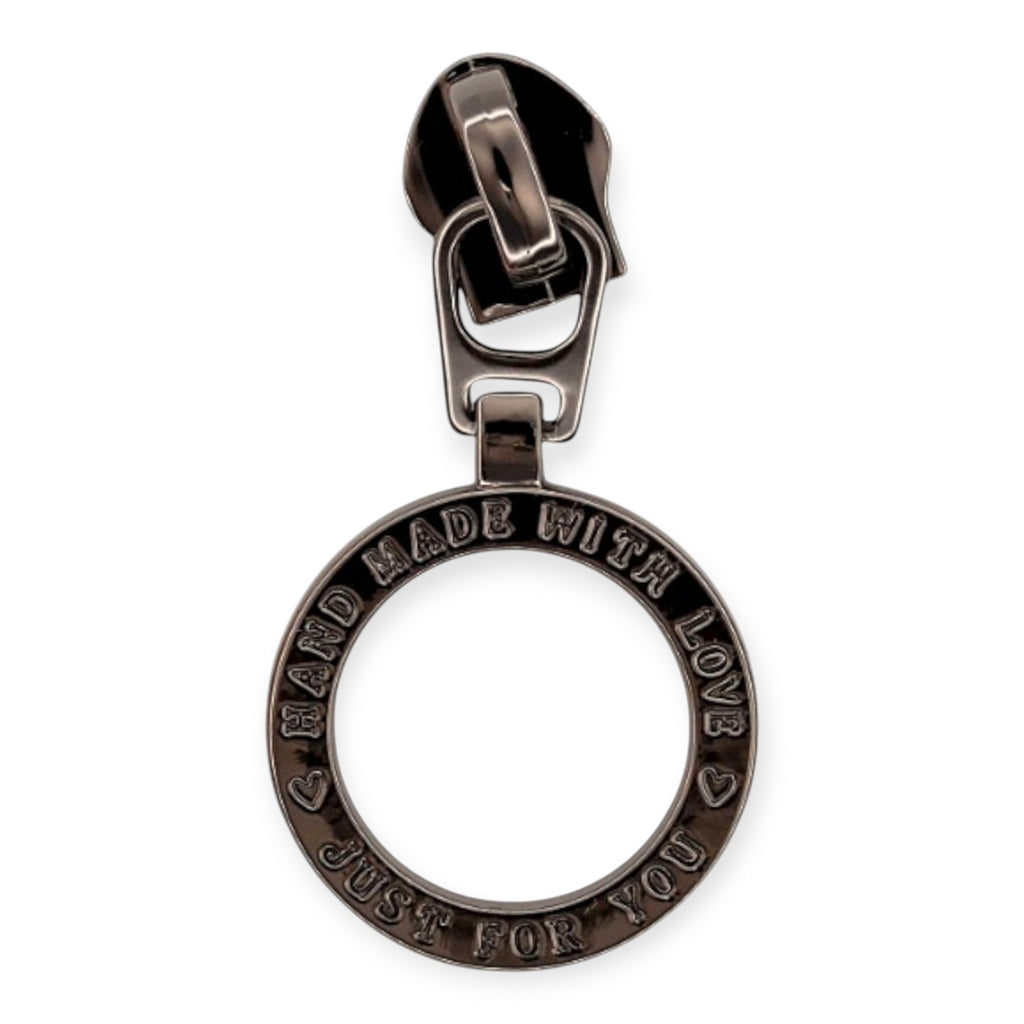Give your bags a polished finished look with these #5 Nylon Zipper Pulls. The circle ring is engraved with Handmade With Love, Just For You and is easy to grip on handbags, wallets, and pouches.