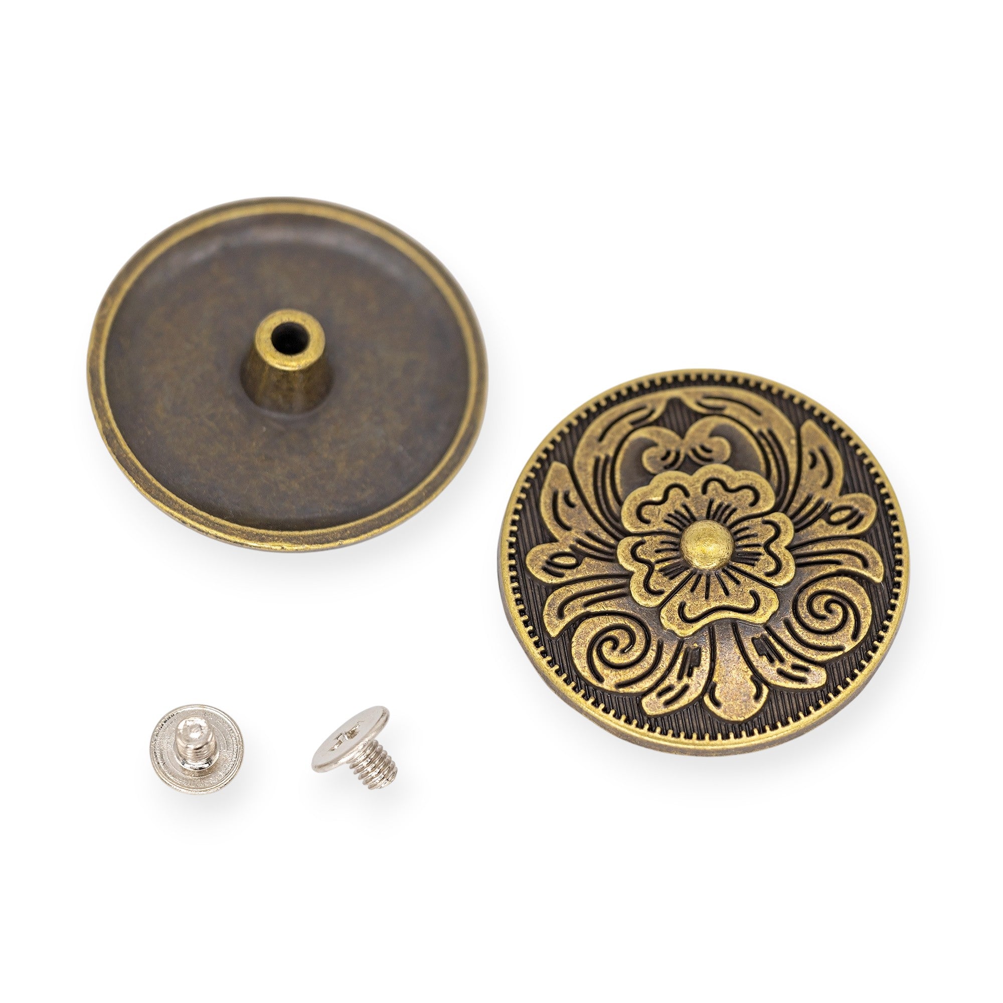 Antique Brass Floral Screwback Conchos are decorative metal fasteners designed for securing through leather, vinyl, or fabric panels. Each round concho features a raised floral design with detailed scrollwork, a dark recessed background for contrast, and a screwback post for secure, removable installation.