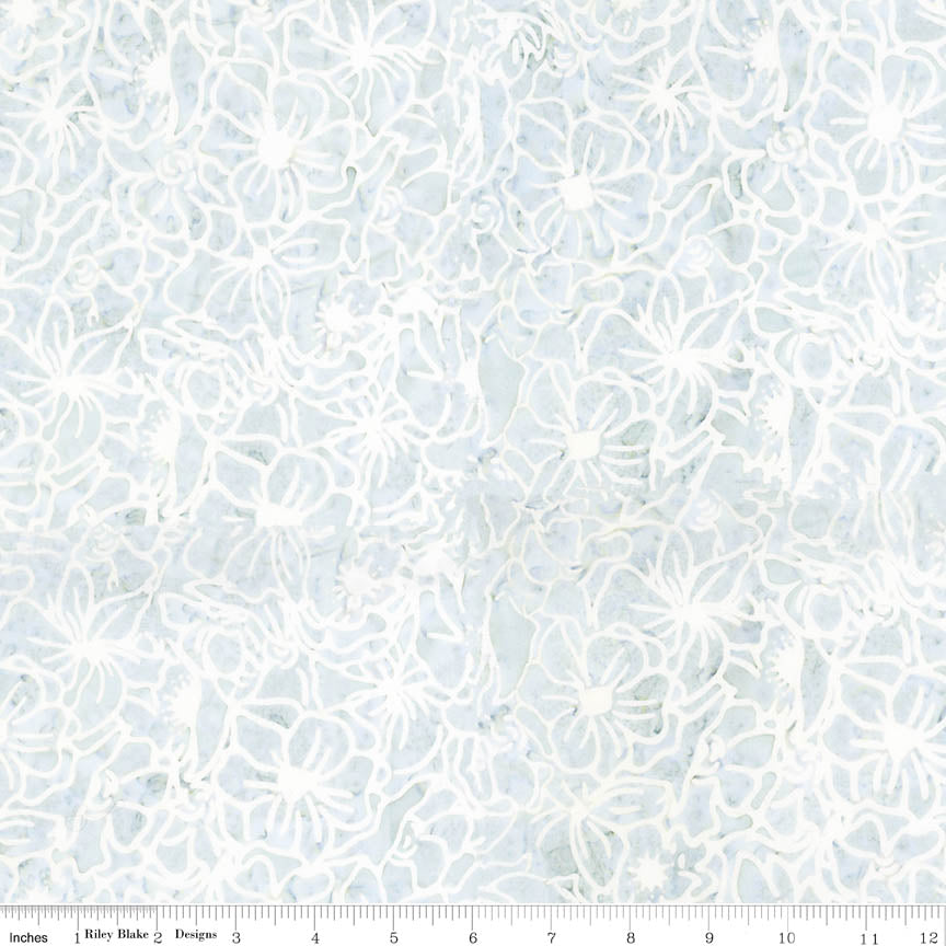 Expressions Batiks Floral Reflections Wisp – 100% Cotton Batik Fabric by the Yard showcases a soft floral texture in pale blue and white tones. Hand-dyed using traditional batik techniques, this light and airy print evokes a gentle watercolor effect, perfect for adding subtle movement and calm to your sewing projects. Ideal for quilting, background accents, or delicate home décor.