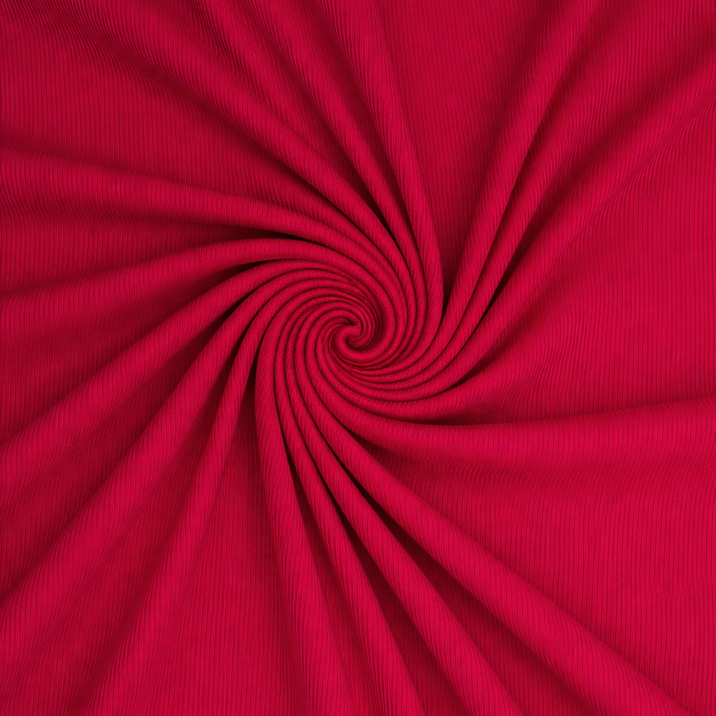 Berry rib knit fabric made with 92% viscose fiber and 8% spandex for a soft, stretchy feel with great comfort and recovery. With a 260gsm weight and a wide 71" width, this rib knit is substantial without feeling bulky, making it ideal for fitted garments that still move with you. It sews well on a domestic machine using a zigzag or stretch stitch, or on a serger. For the cleanest hems, a twin needle or coverstitch works beautifully.