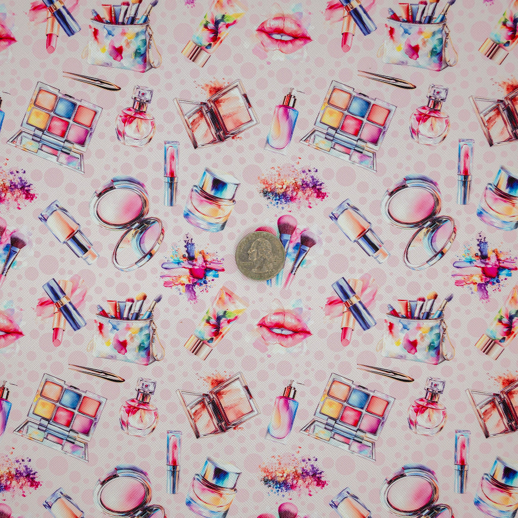 Add bold structure to your next bag project with Glam Jam Saffiano Texture Vinyl. Makeup brushes, palettes, lipsticks, gloss, and perfume dance across a soft pink dotted background for a fun, feminine look. The crosshatch Saffiano finish adds body, reduces glare, and wipes clean, perfect for cosmetic bags, makeup artist totes, and accessories.
