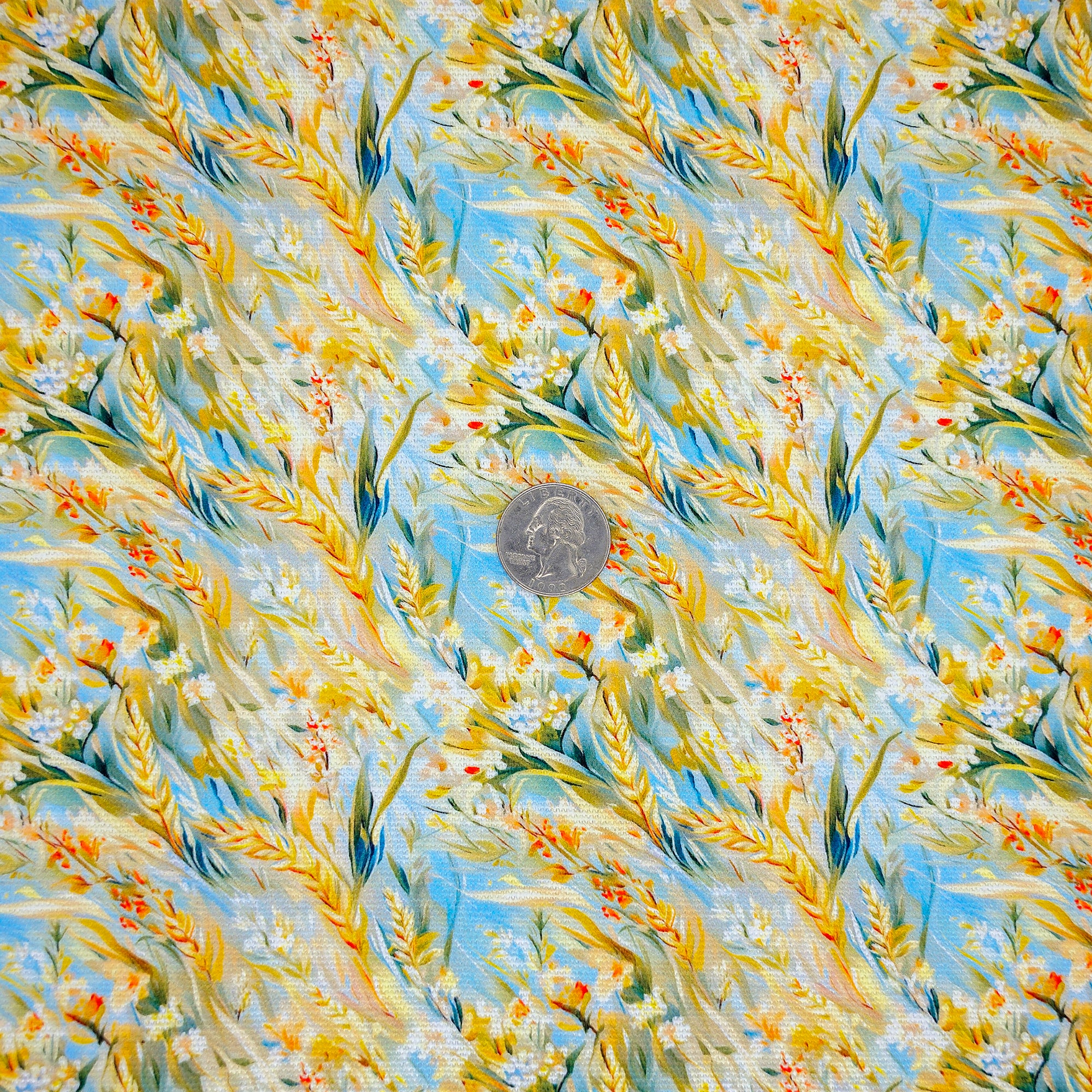 Golden Wheatfield 12 oz Water-Resistant Cotton Canvas captures the feel of a breezy, sunlit field. Painterly wheat stalks, soft florals, and wind-swept grasses in golden ochre, ivory, and sage flow across a pale blue sky background. This nature-inspired design adds movement and warmth to your handmade bags and accessories. The PU coating adds moisture resistance while keeping the soft, natural texture of cotton canvas.