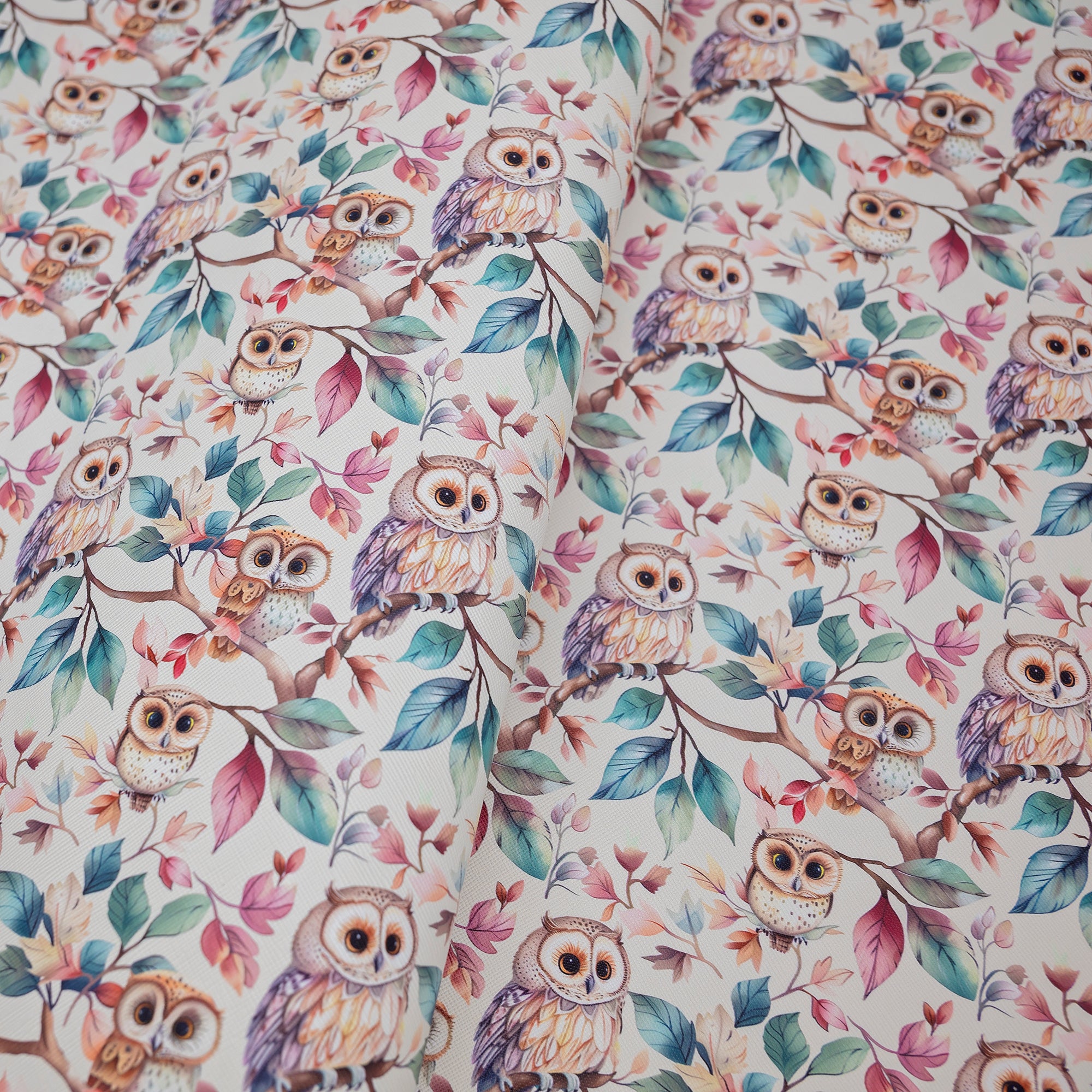 | Hoot & Hallow Printed Vinyl | 18" × 53" roll Saffiano texture with owl and foliage print |