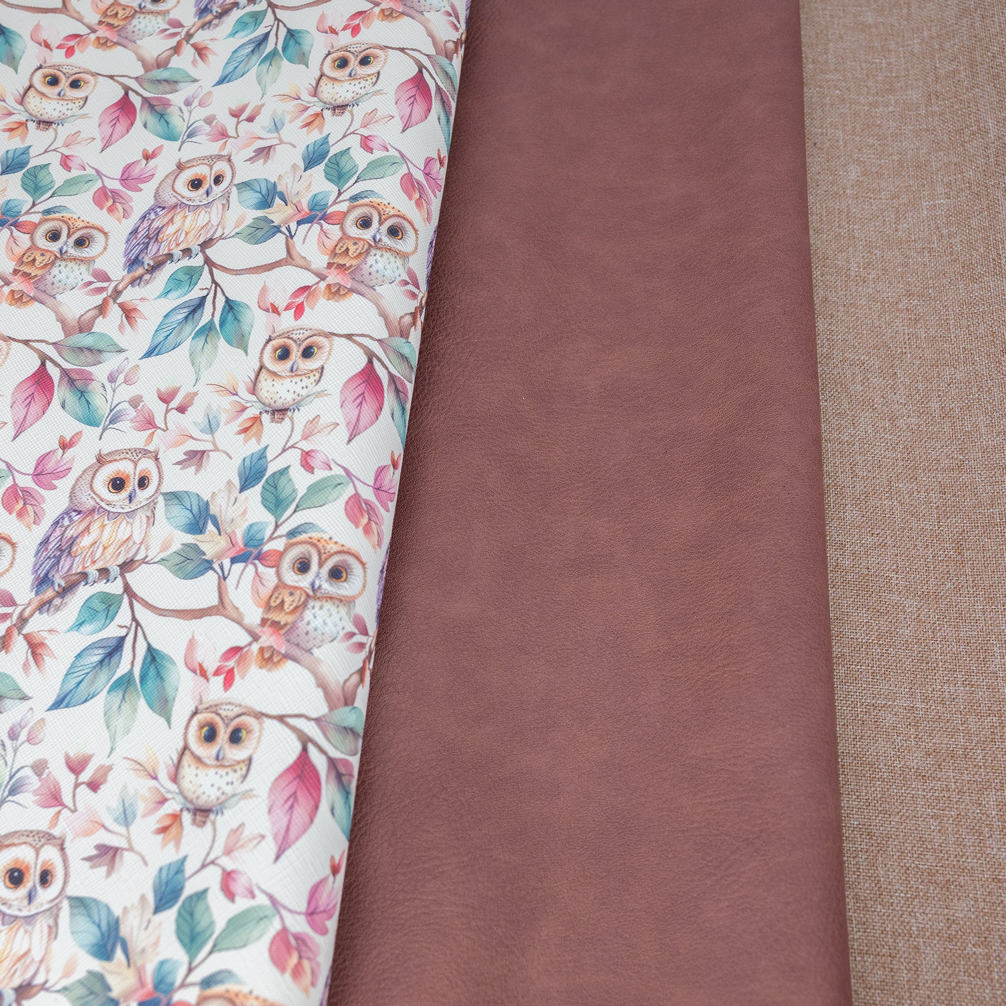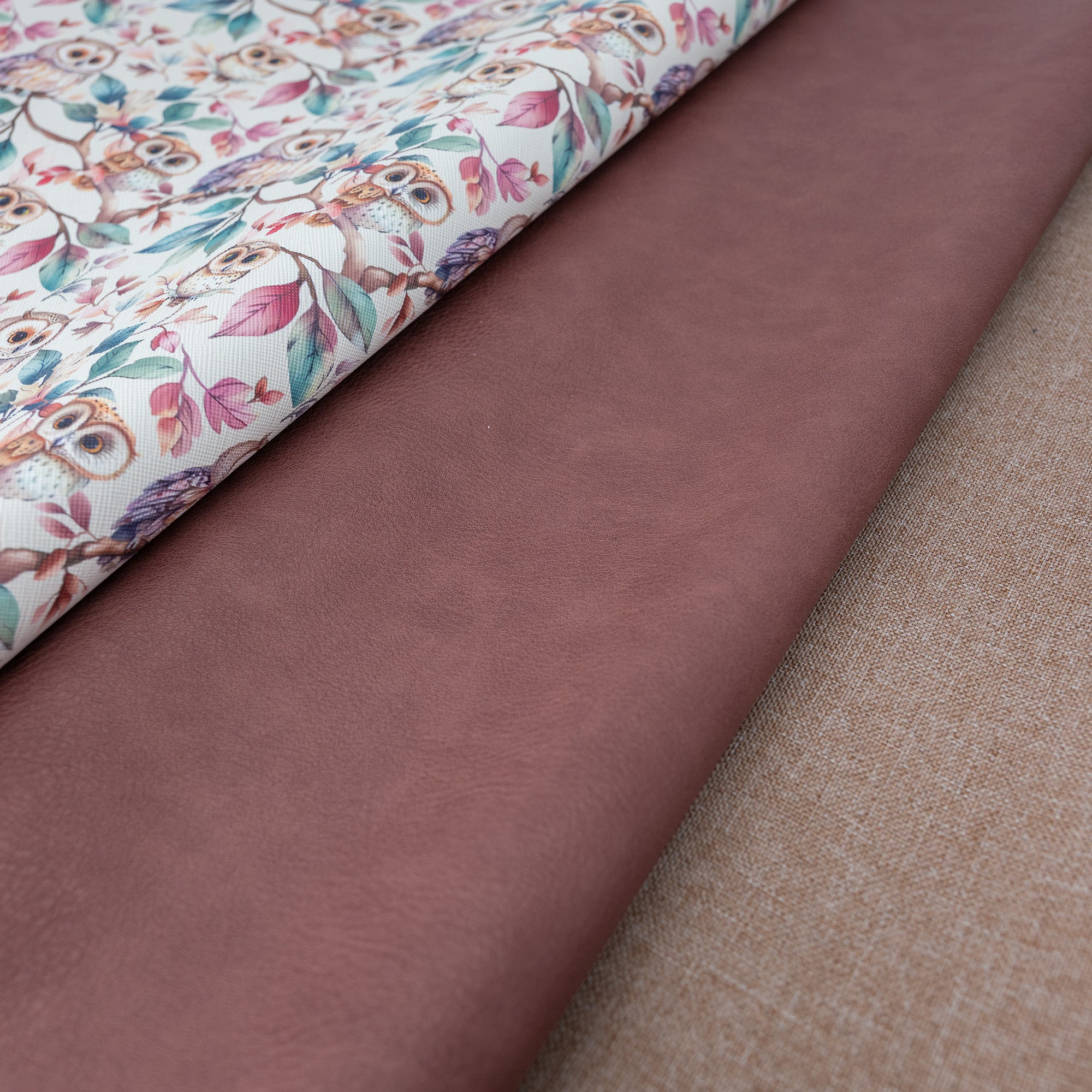 Hoot & Hallow Fabric Bundle for bag making combines soft woodland charm with warm, grounded tones for a cozy yet polished finish. This curated bundle pairs a whimsical owl-printed vinyl with rosewood mauve faux leather and a neutral waterproof canvas lining, making it ideal for handbags, totes, and accessories that feel playful but refined.