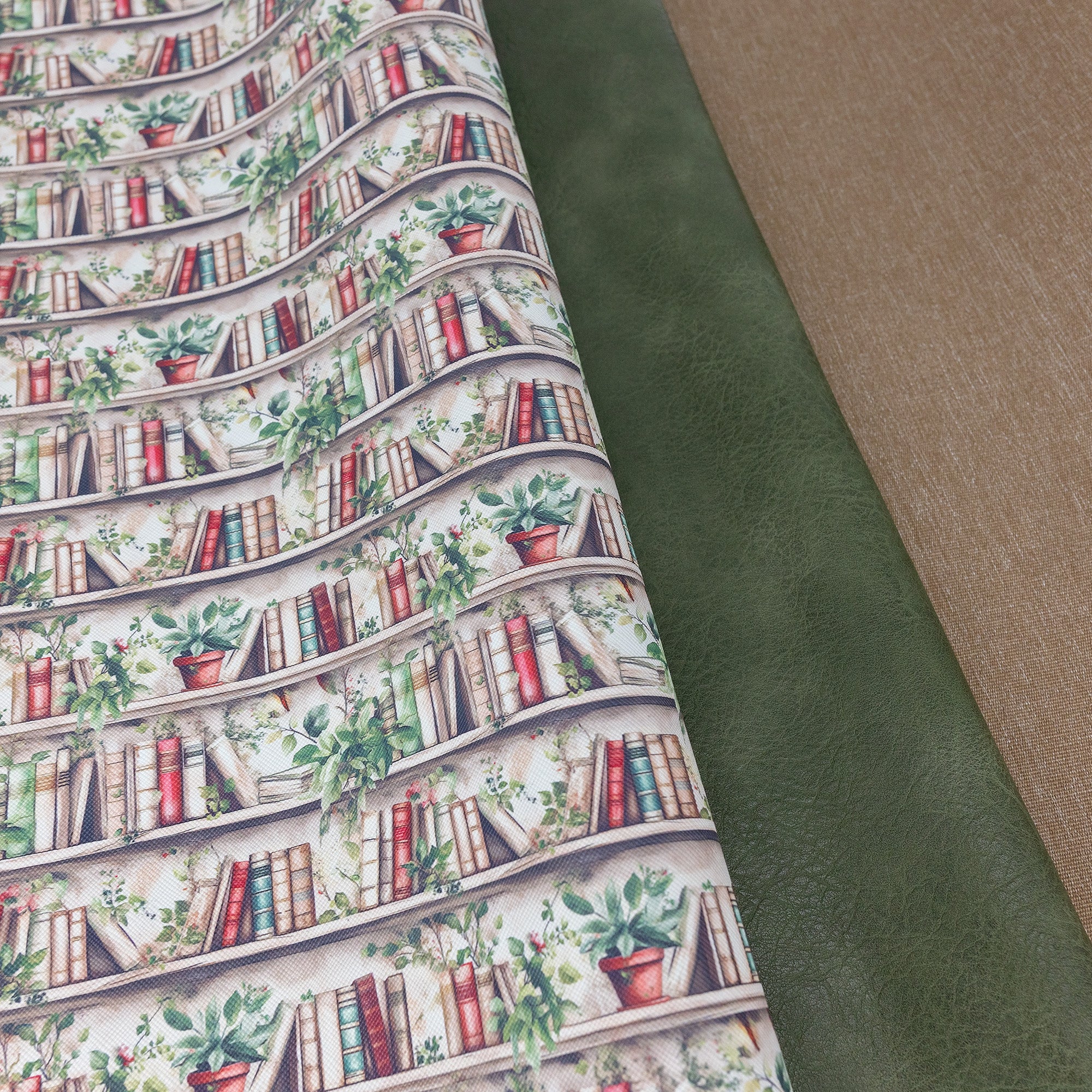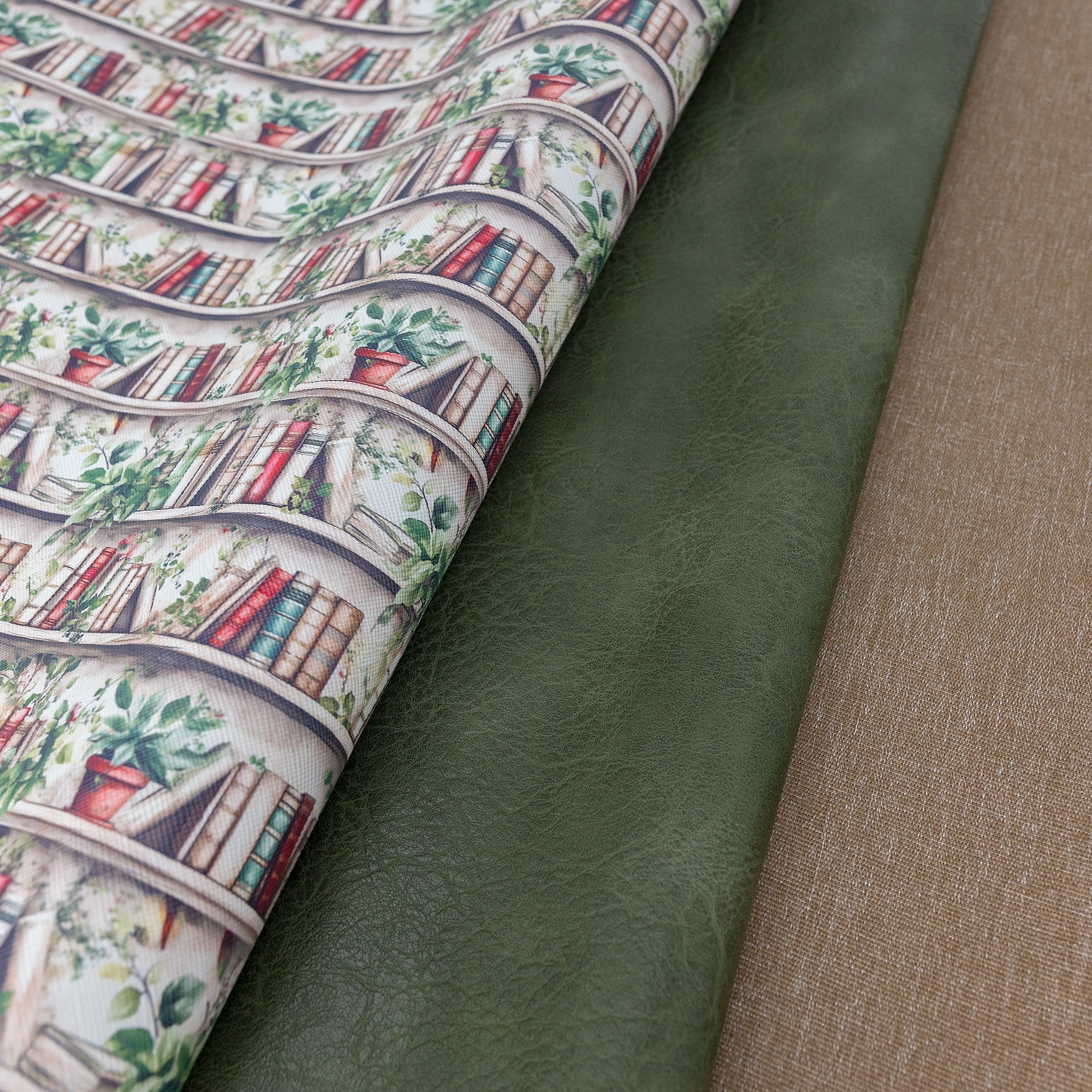 Library Retreat Fabric Bundle for bag making pairs a cozy, book-filled printed vinyl with rich olive faux leather and a warm shimmer lining for a timeless, relaxed finish. This curated bundle is perfect for handbags, totes, and everyday accessories with a classic, lived-in feel that still looks polished and intentional.