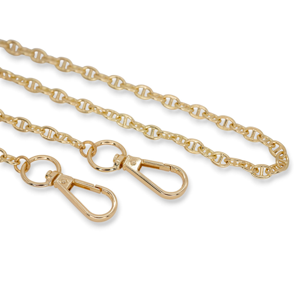 This light gold mariner link bag chain strap adds a premium, high-end finish to any handmade purse. Crafted from durable brass with a smooth light gold plating, this chain includes matching swivel clasps that let you attach it securely to any handbag, crossbody, or small tote.